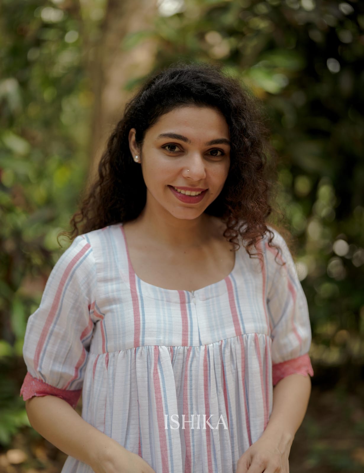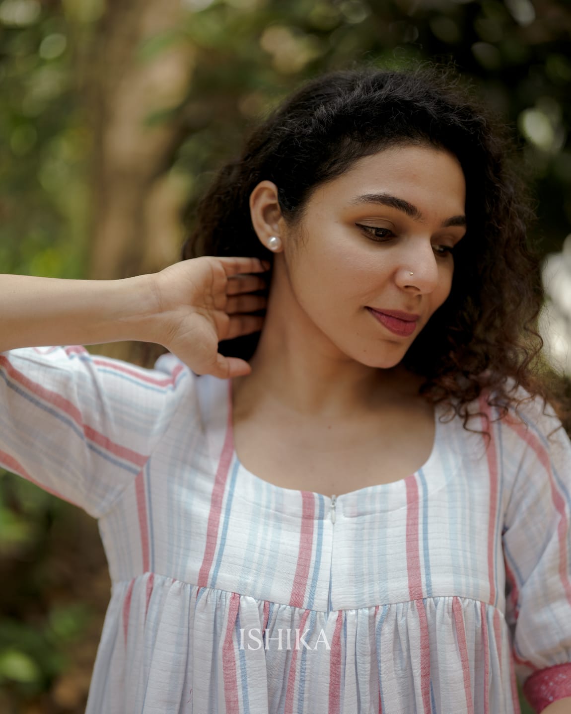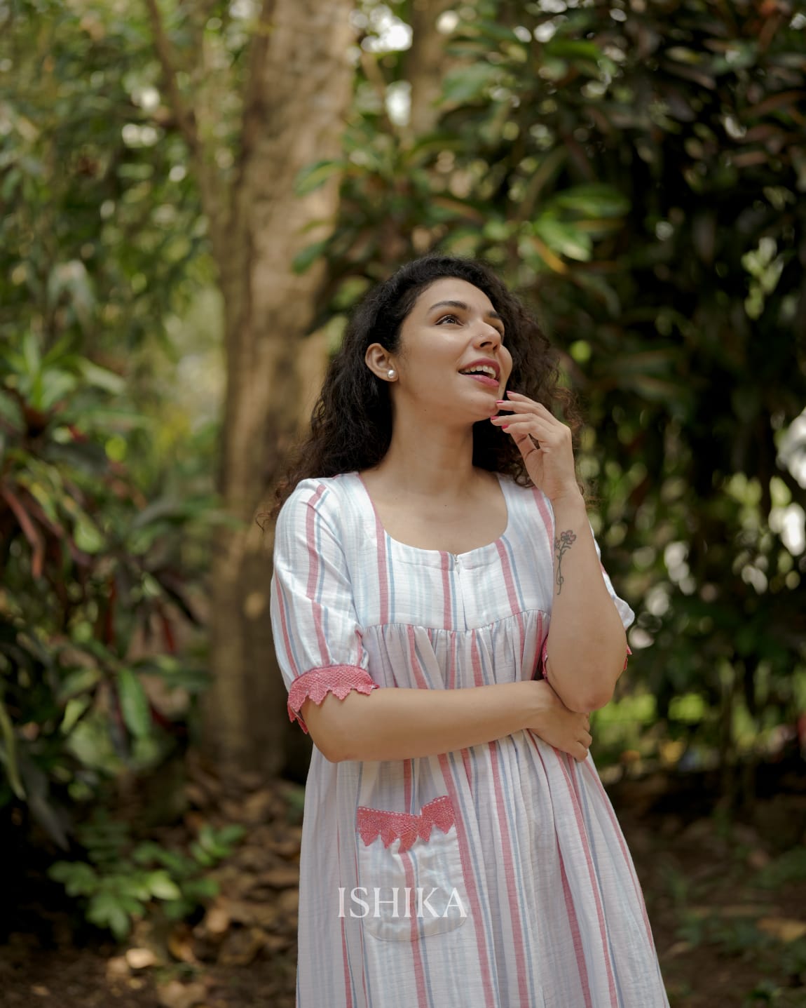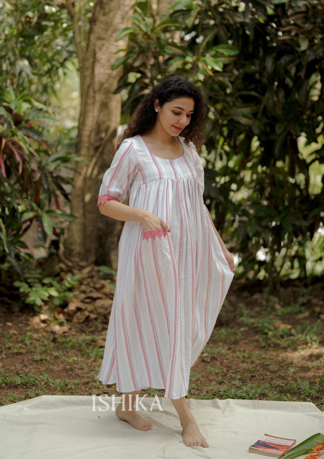 Premium home gown with high-quality soft cotton, featuring Round neck. Gathers added on yoke. Pocket attached on dress detailed with lace. Pleats and lace added on end of sleeve. Feeding Zip on the yoke. ( 1 invisible Zip)