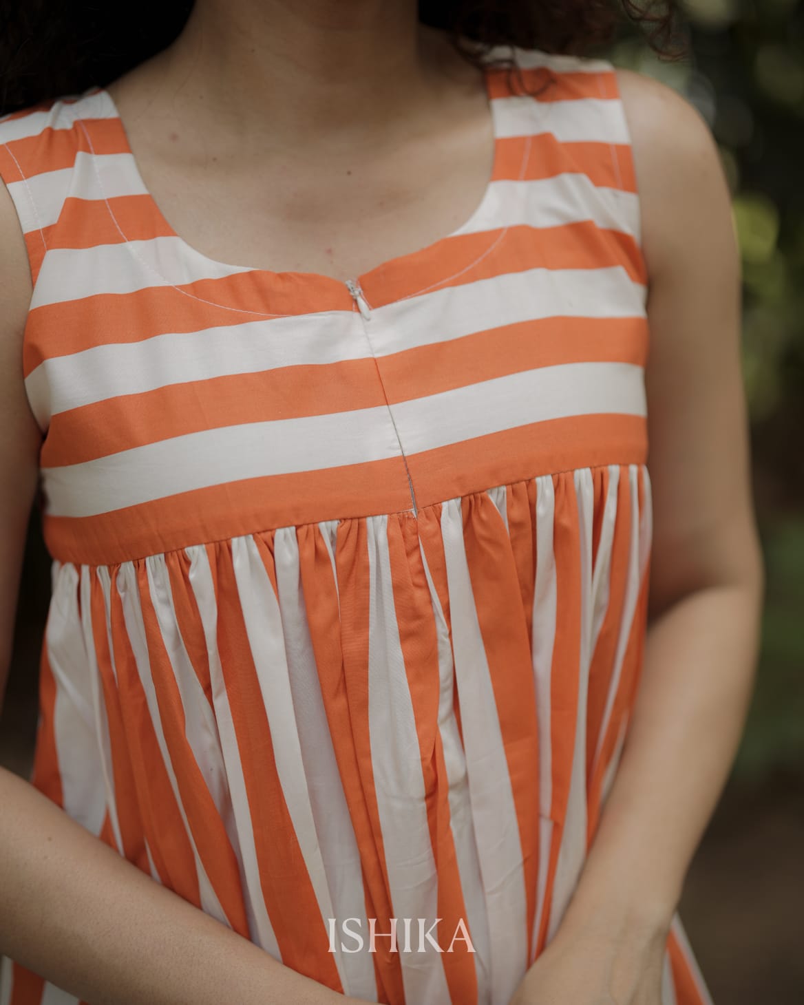Cotton home gown featuring Round neck and Horizontal stripes on Yoke. Gathers added on yoke. Feeding Zip on the yoke. ( 1 invisible Zip)
