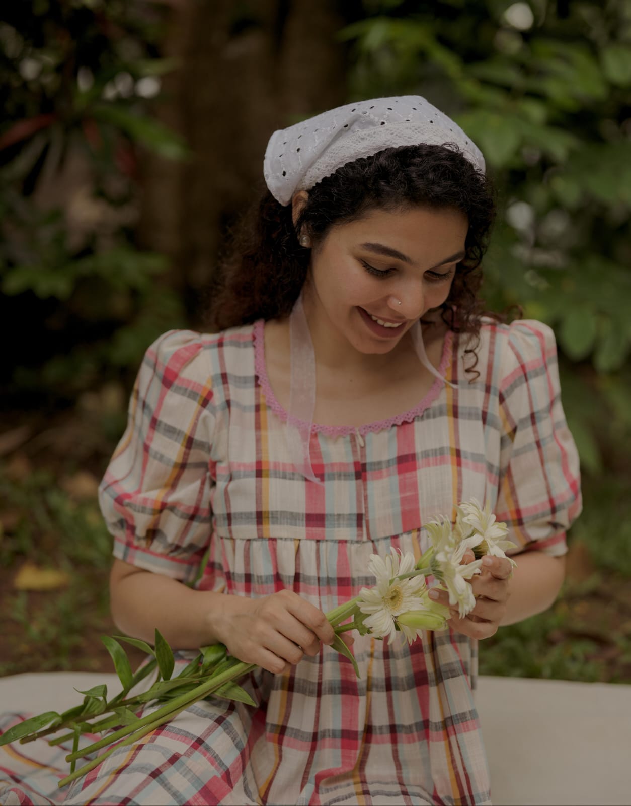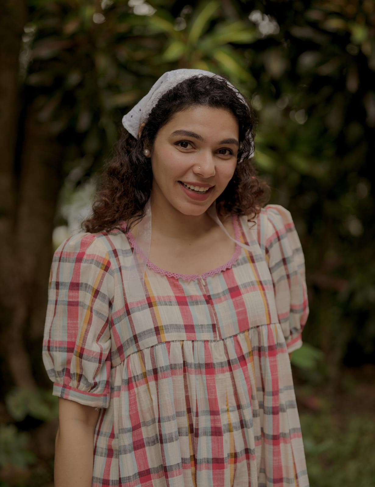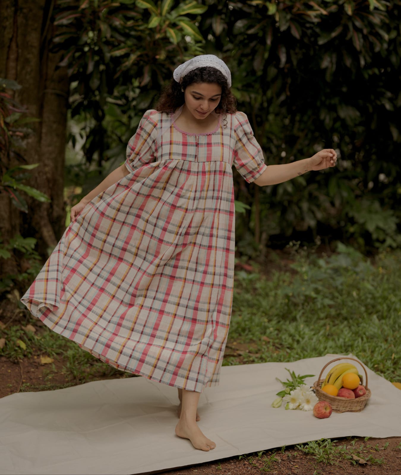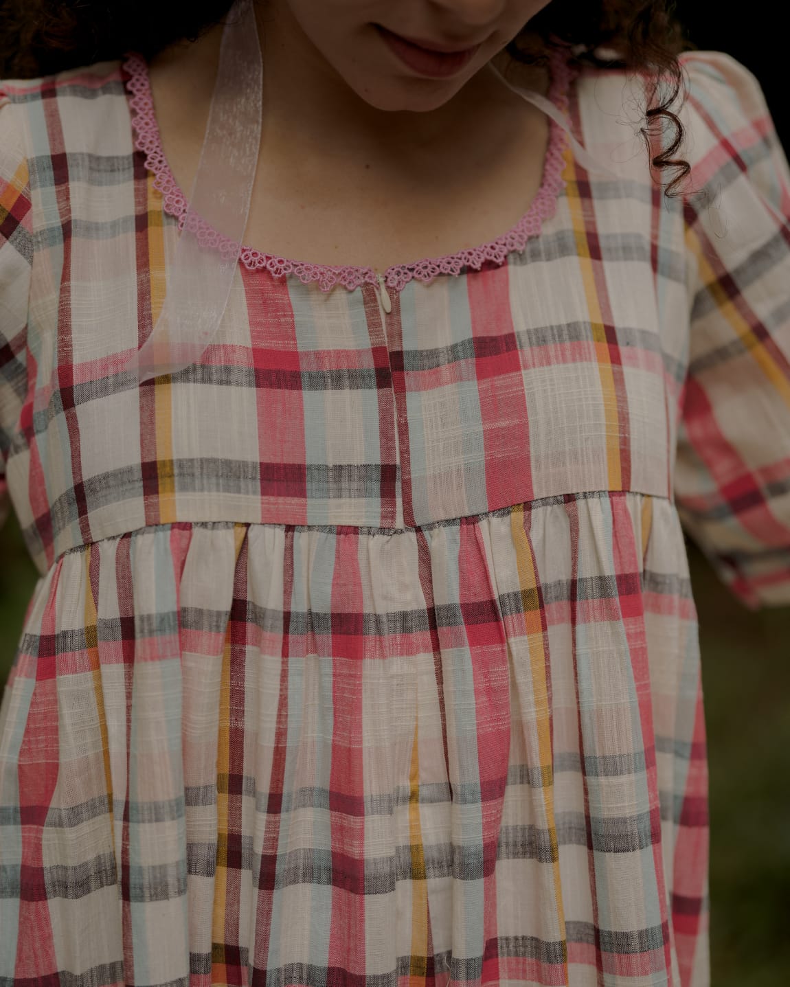 Color:- Off-white as the base, with lines of red, pink, yellow, blue, and gray.