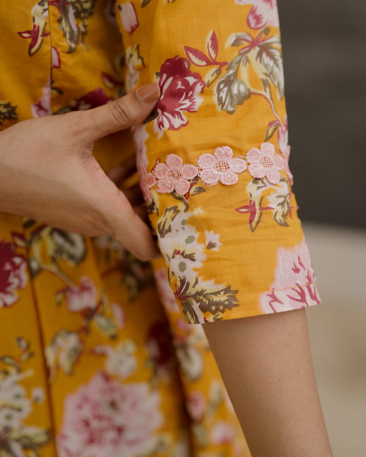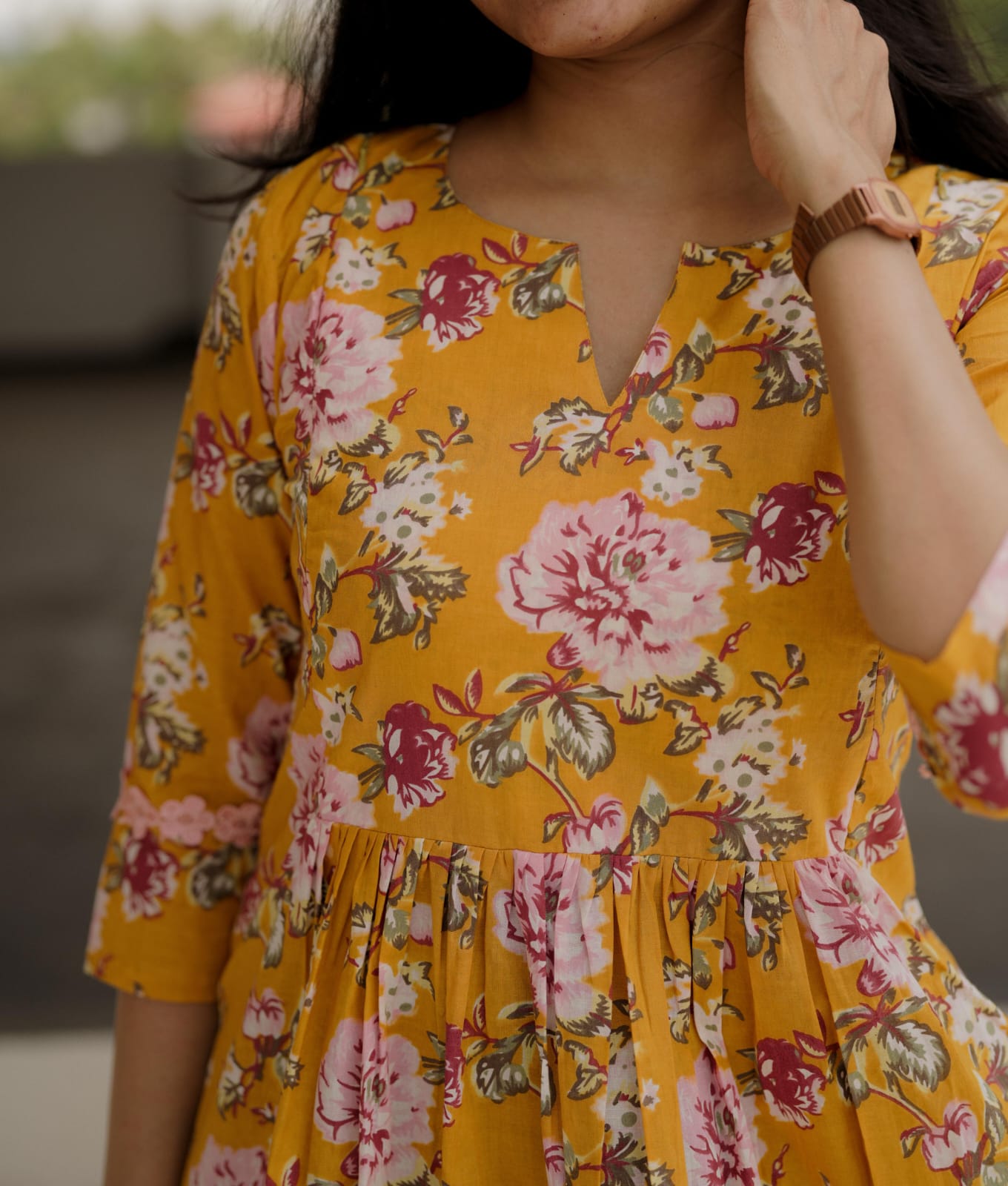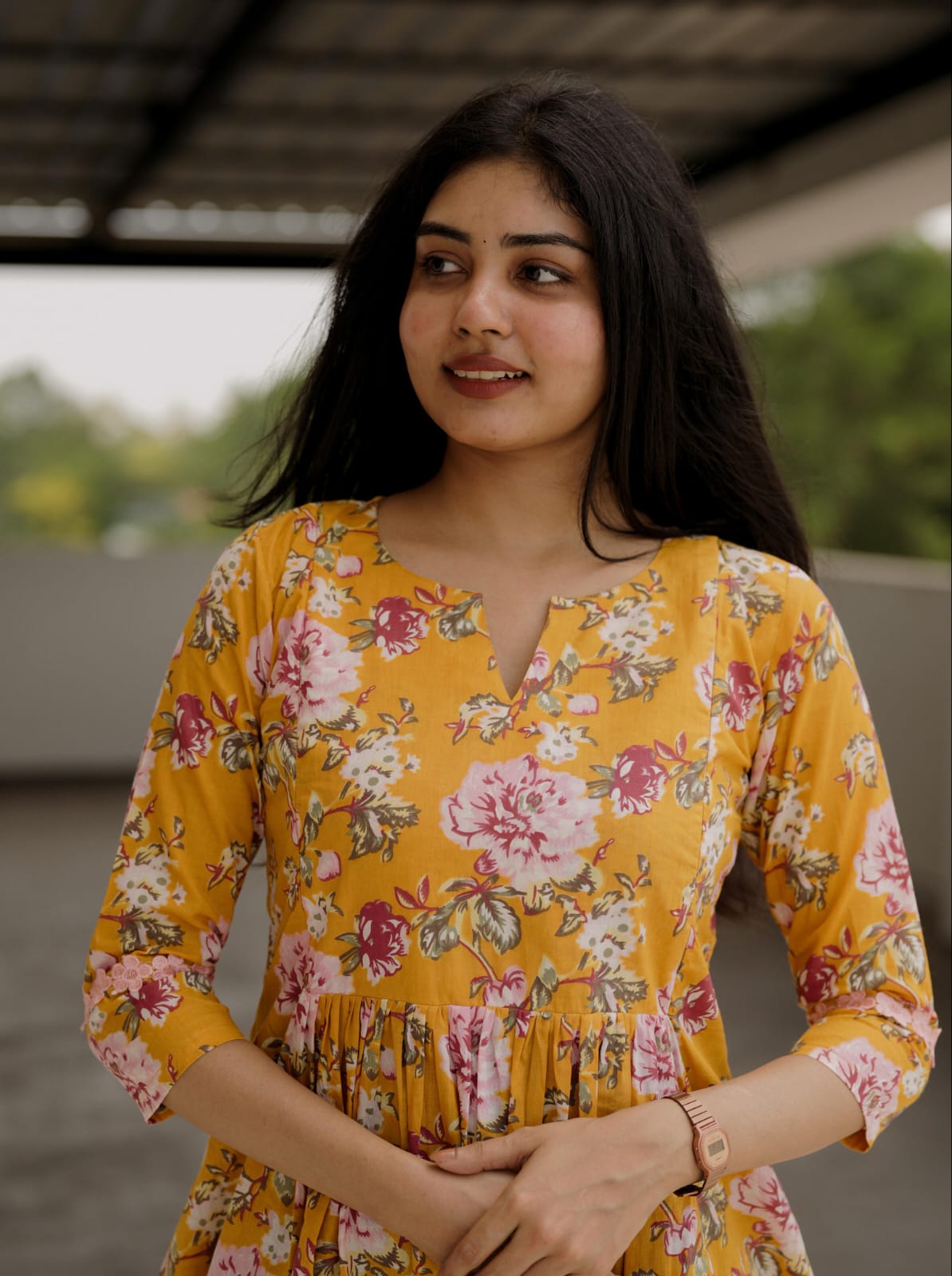 Floral Printed Cotton A line Dress with Slit on Neck. Gathers on Waist. Lace on Sleeve. Feeding Zip Placed on the yoke. (2 invisible Zips).