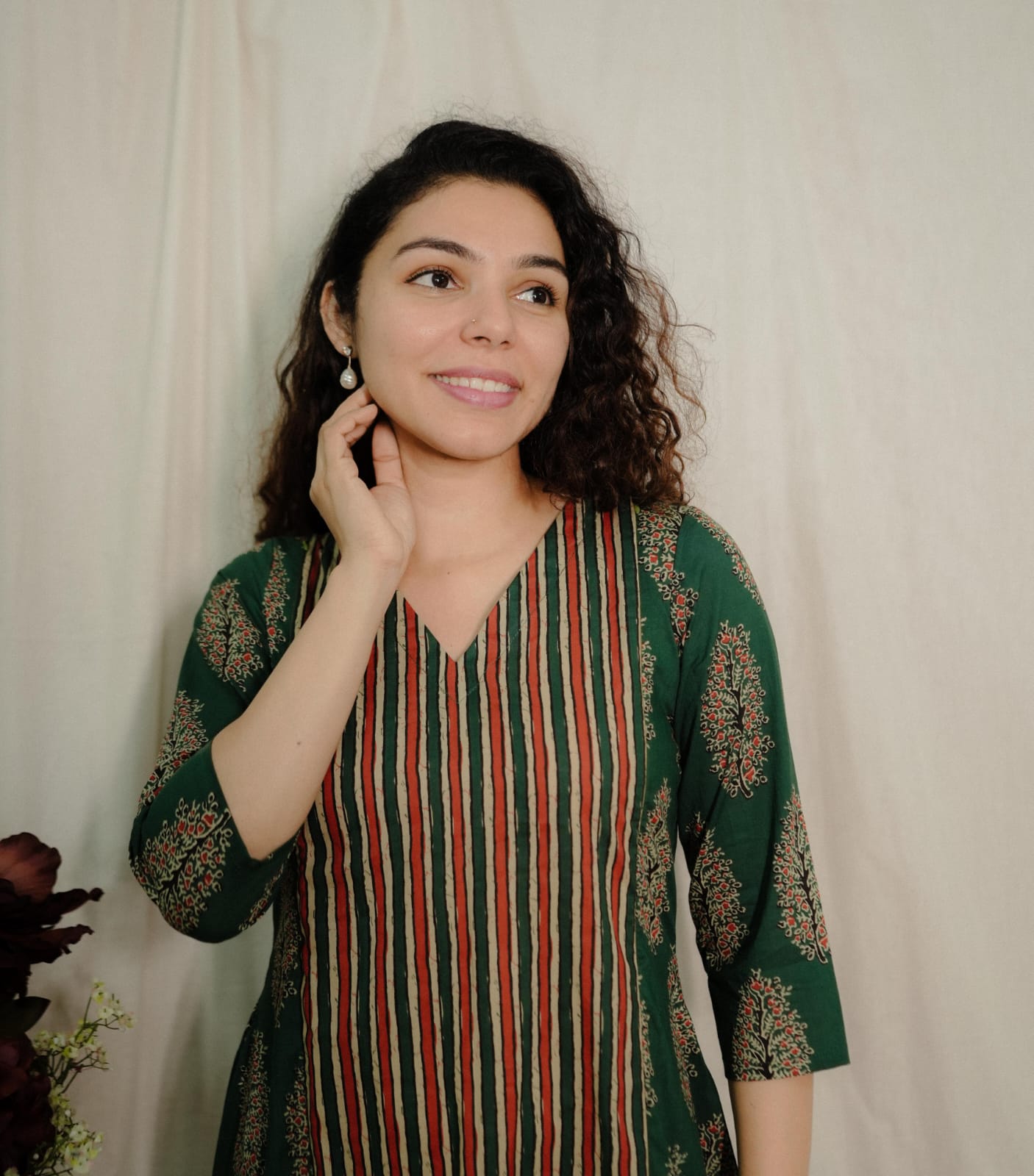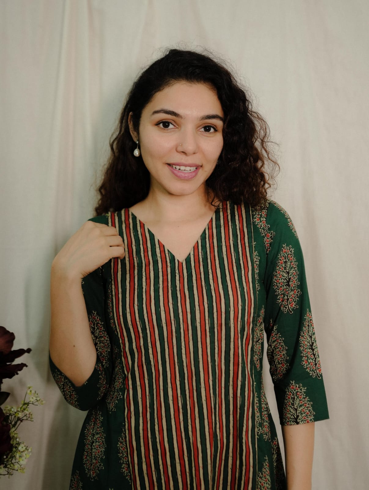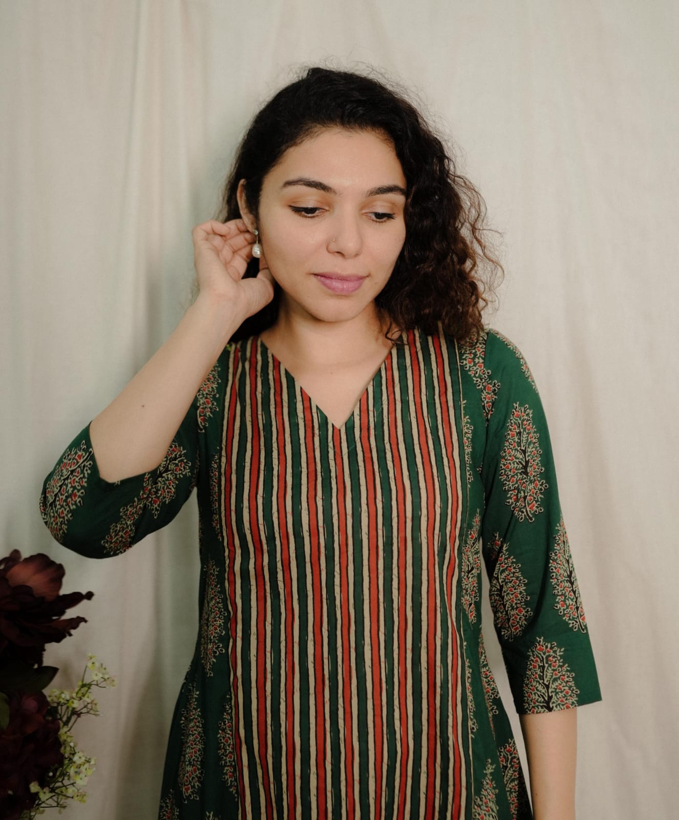 Printed A Line cotton kurthi with panel cut. Designer Print cotton front panel with V neck.