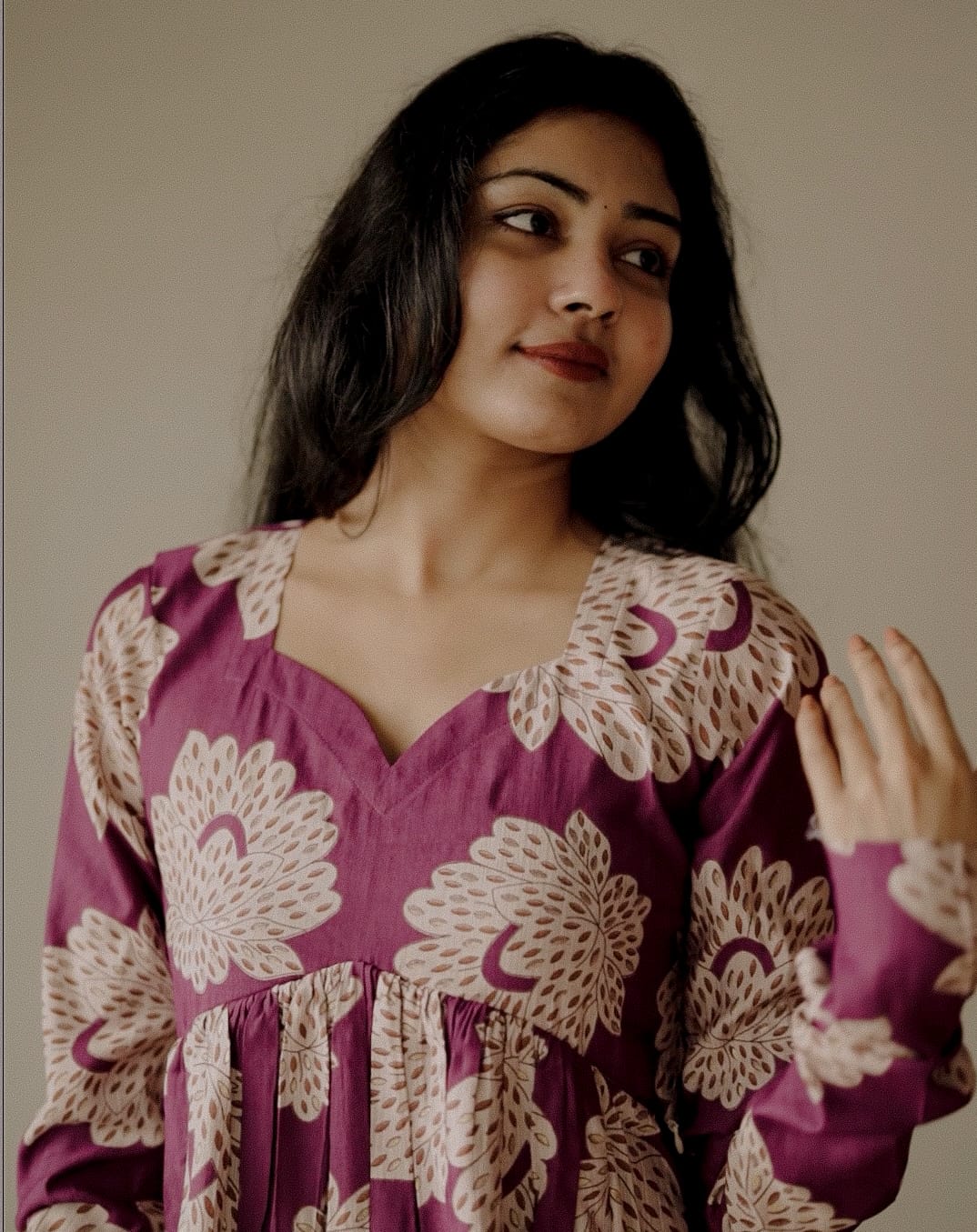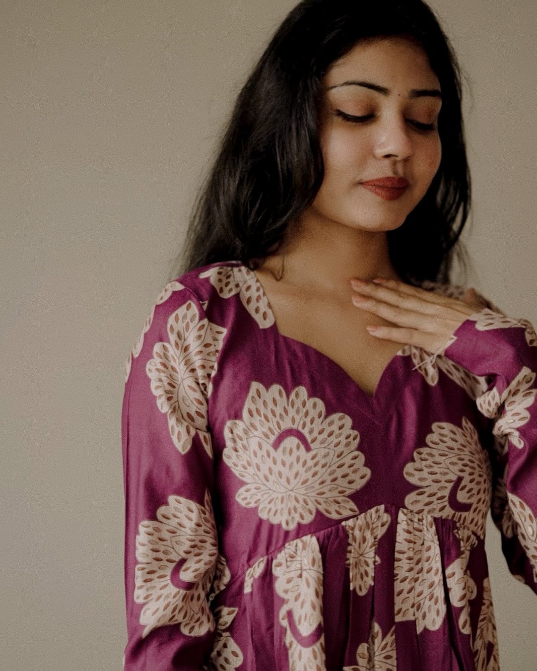 Floral Printed Muslin Silk Alia Cut dress with Sweet Heart Neck. Gathers on yoke. Churi Sleeve. Feeding Zip Placed across the yoke. ( 2 invisible Zips).