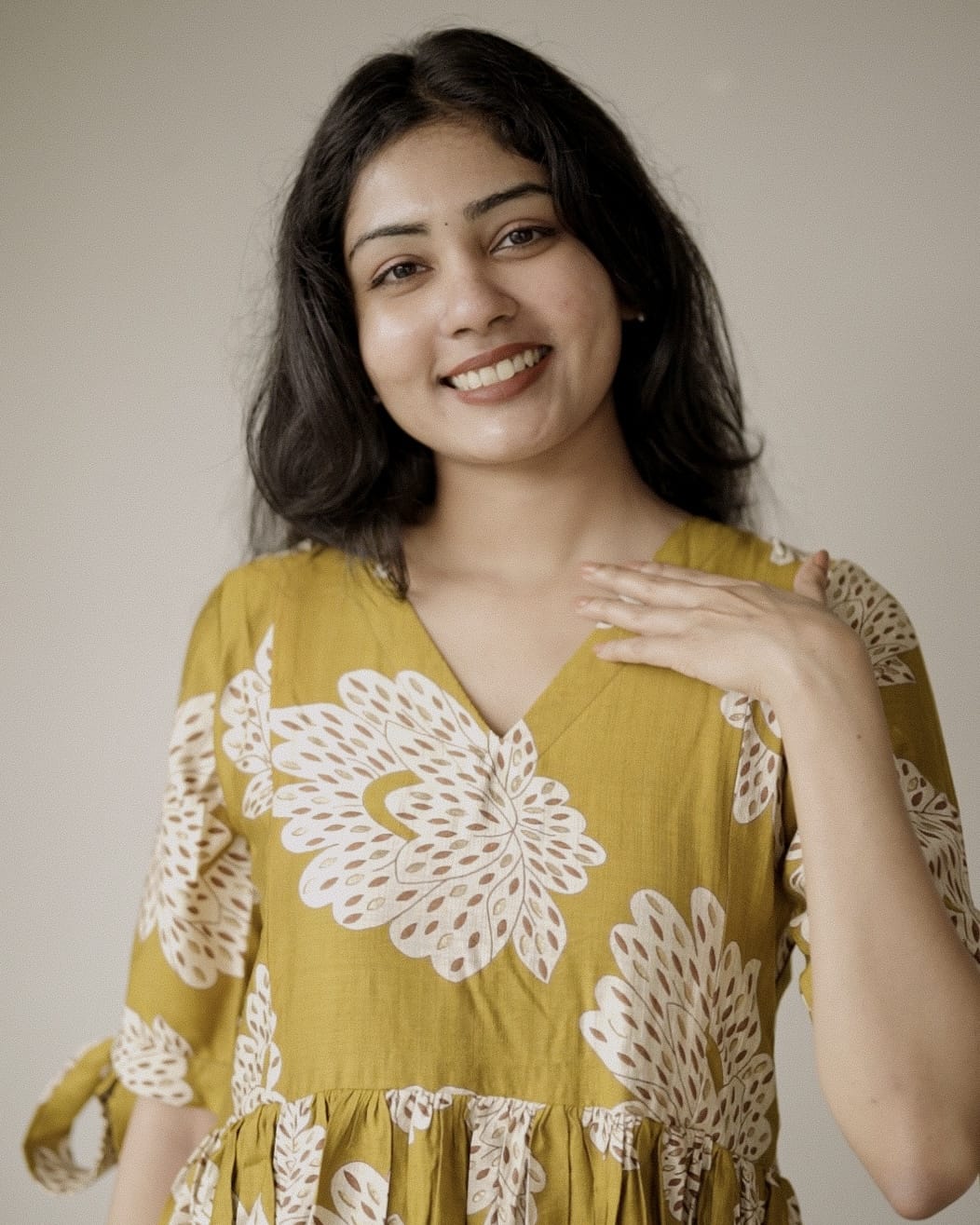 Floral Printed Muslin Silk dress with V-Neck. Gathers on yoke. Elbow sleeves with Tie-up Bow. Feeding Zip Placed across the yoke. ( 2 invisible Zips).