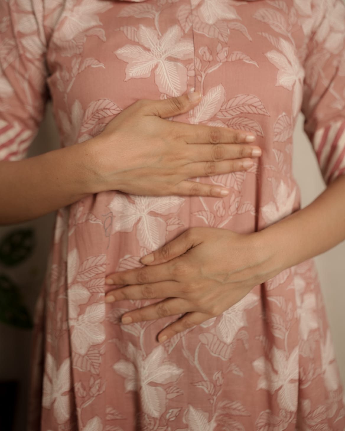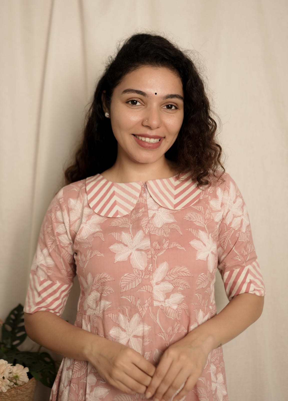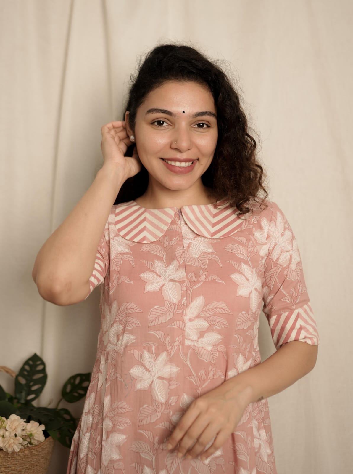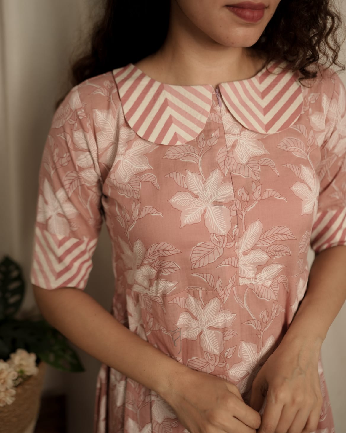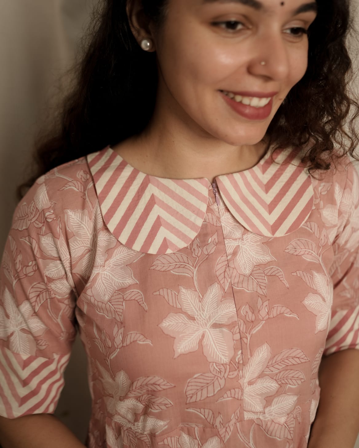 Cotton Floral A line Dress with Peter pan collar . Elbow sleeve with patch on sleeve end. Yoke portion includes pleats. Feeding Zip Placed on the yoke. (2 invisible Zips).