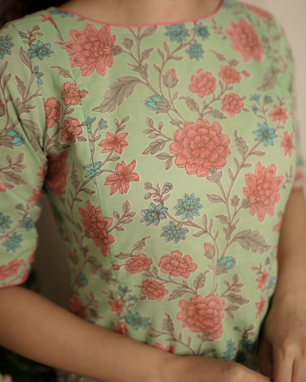 Floral Printed Cotton A-Line Dress with Pocket detail on the front. Elbow sleeve with Piping. Feeding Zips Placed on the yoke. (2 invisible Zips).
