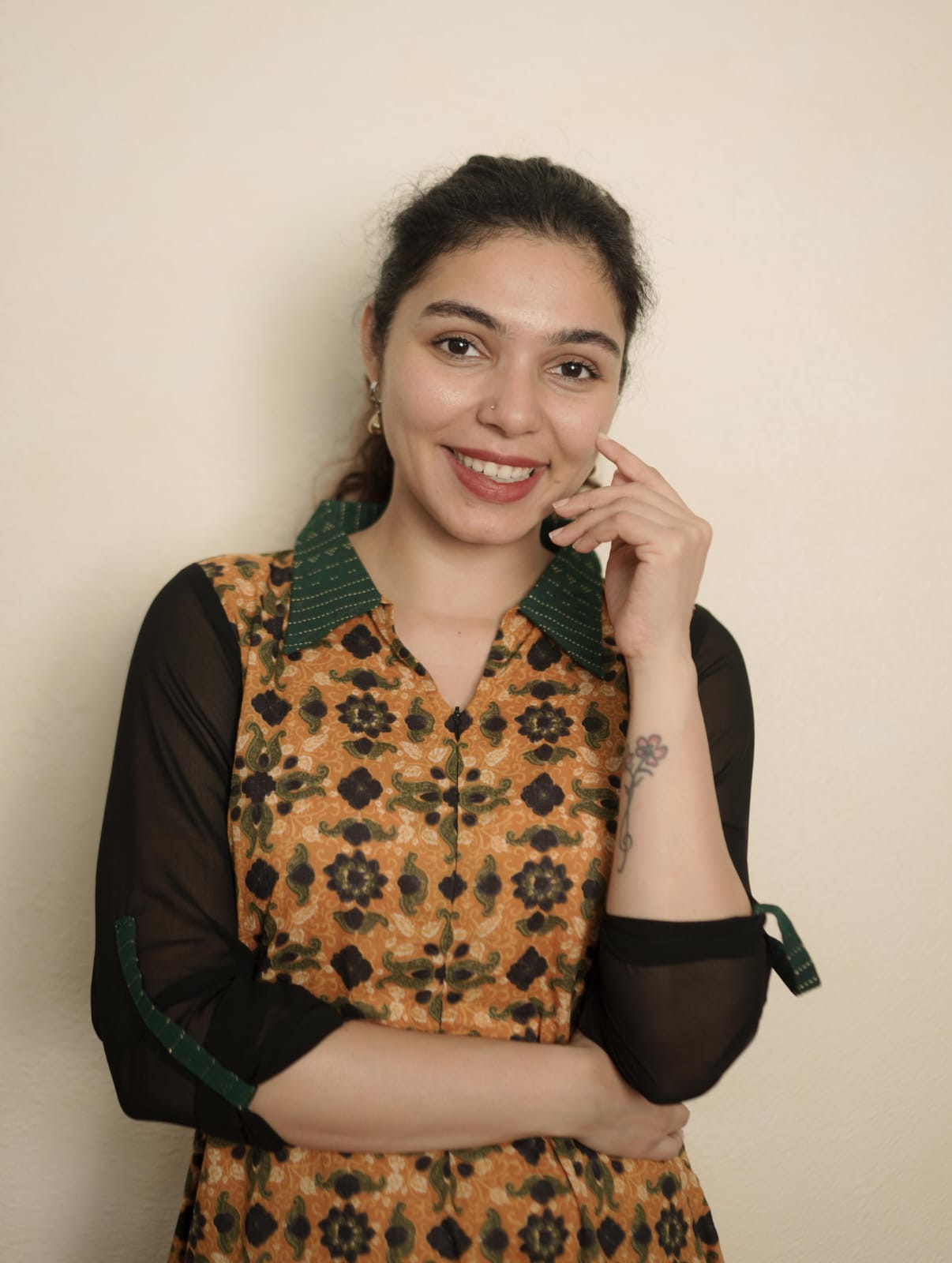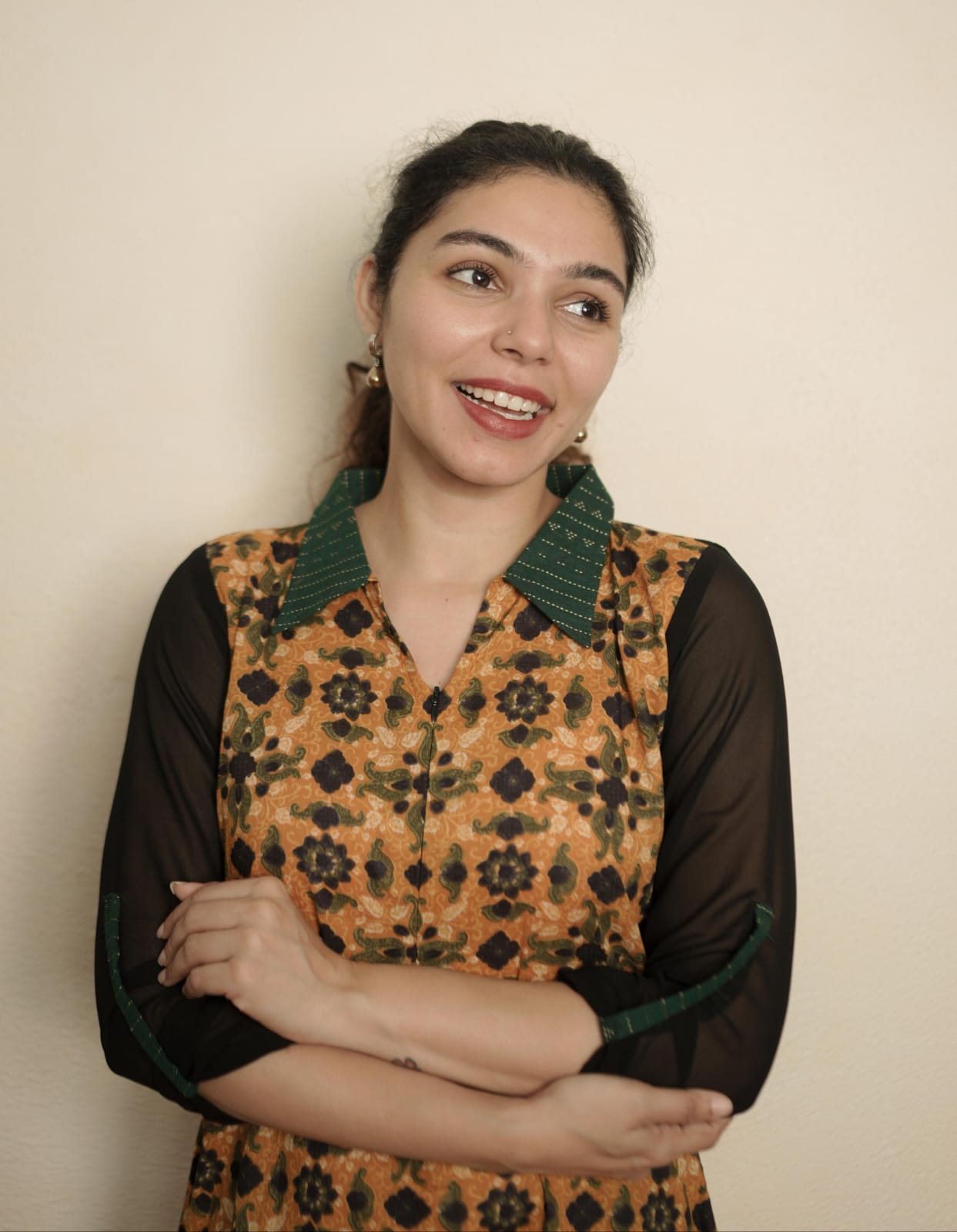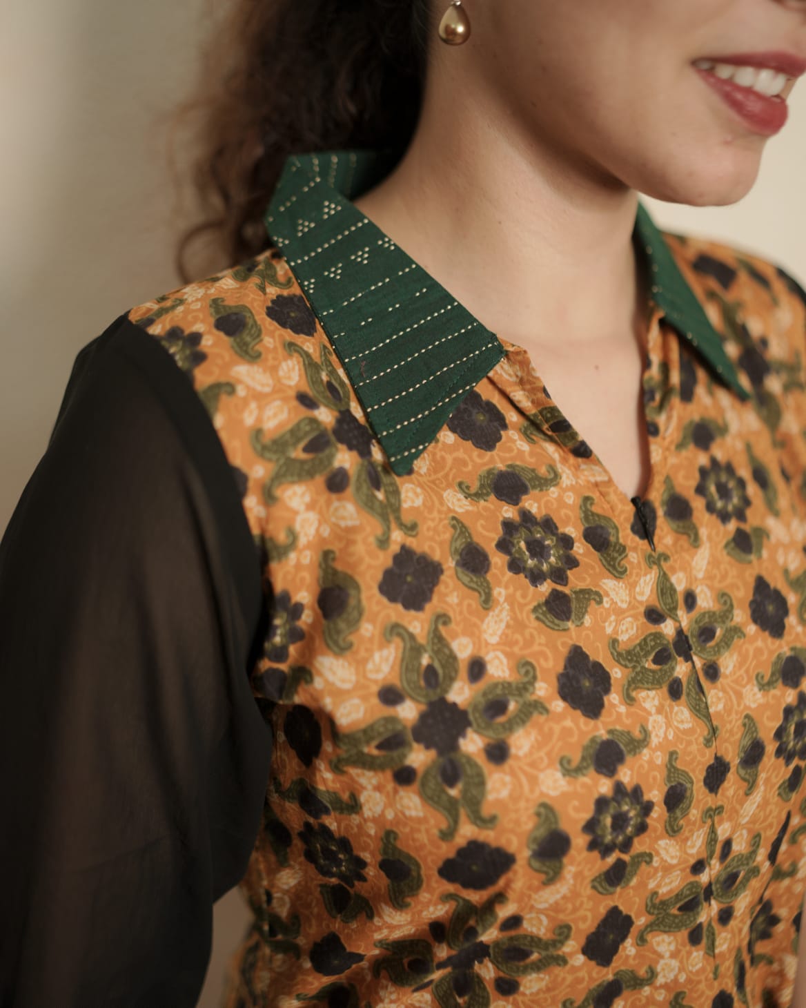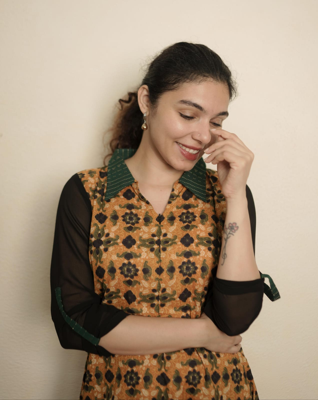 Printed Cotton A-Line Dress with Shirt Collar. Georgette sleeve with Flap. Feeding Zip Placed on the yoke. (1 invisible Zip).