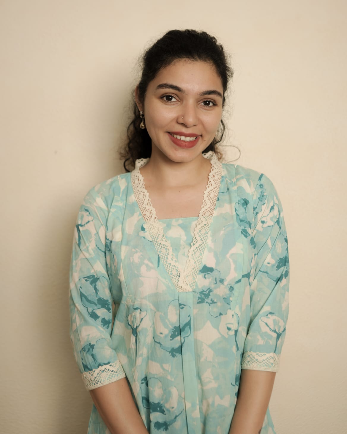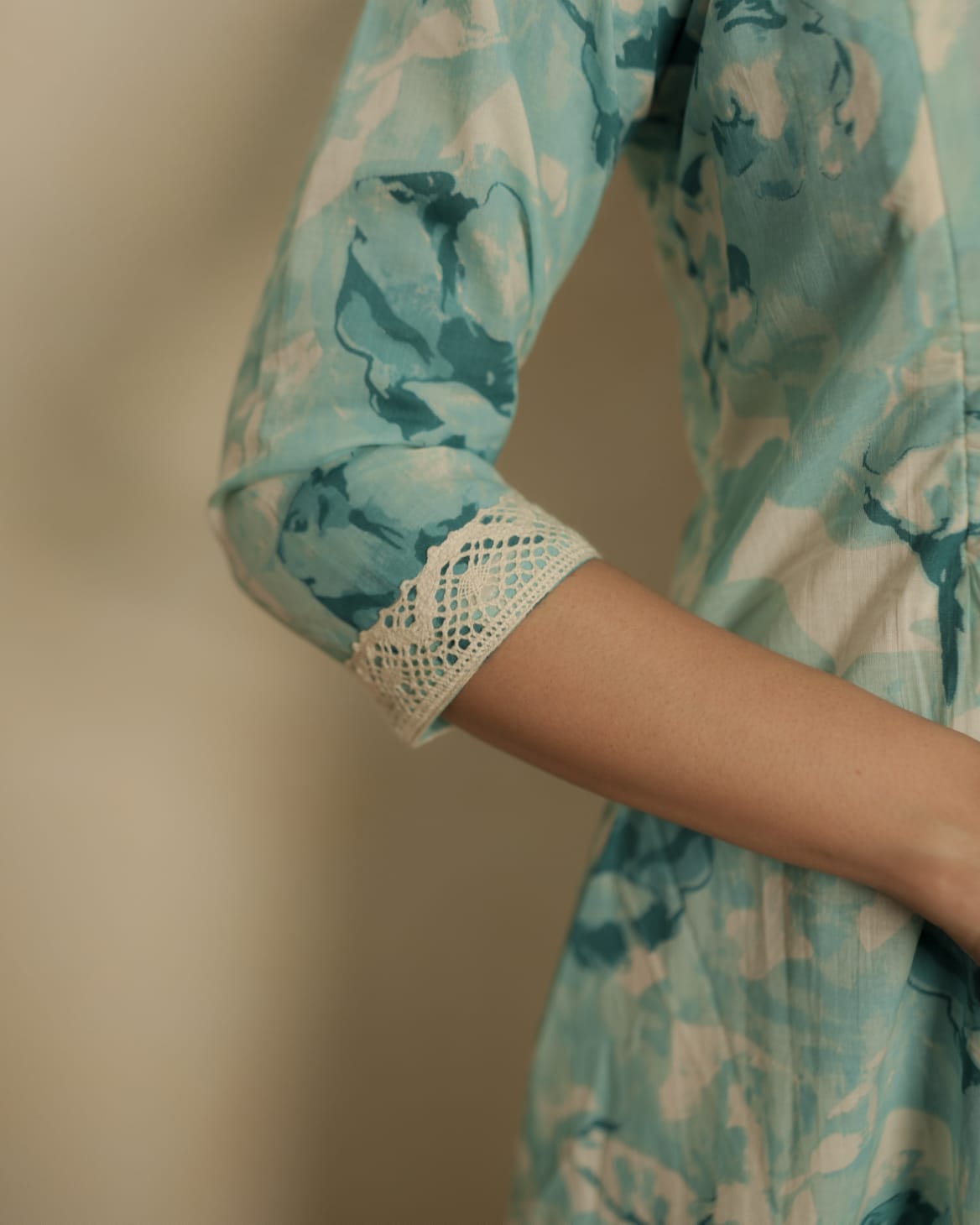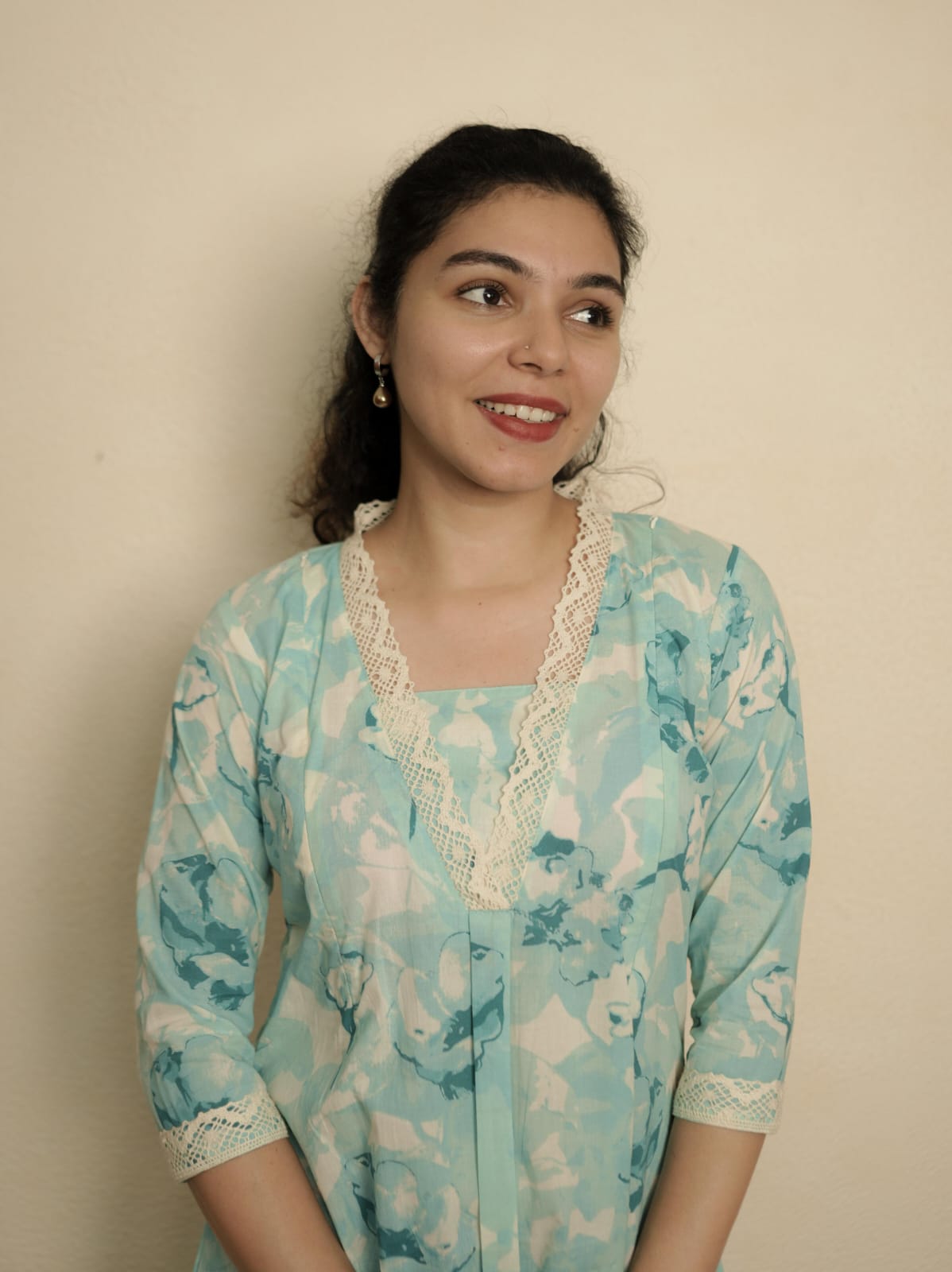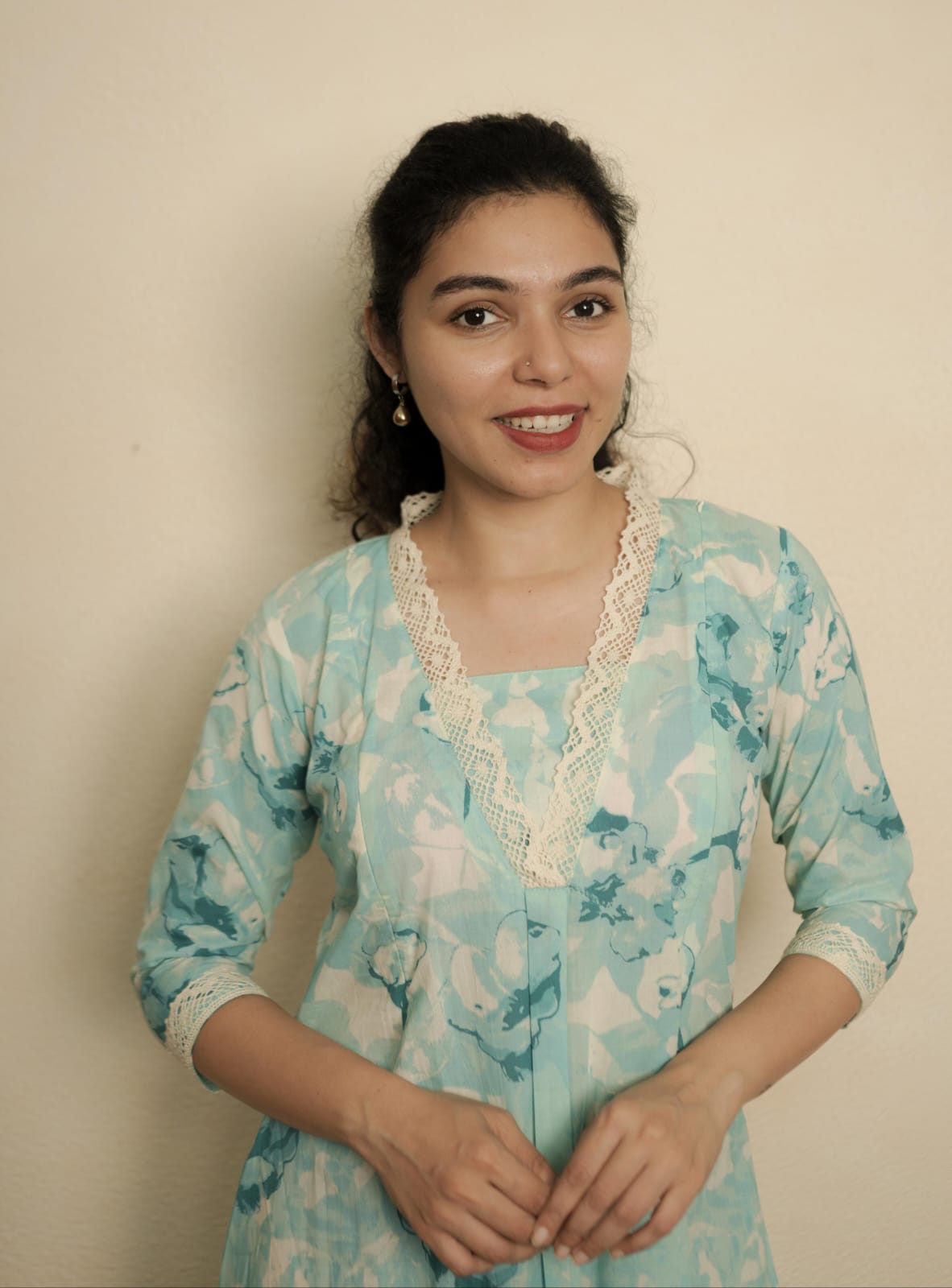Printed Cotton A Line Kurthi with Lace on Neck. Inverted Pleat on Yoke. Lace attached on sleeve end. Feeding Zip Placed on the yoke. (2 invisible Zips).