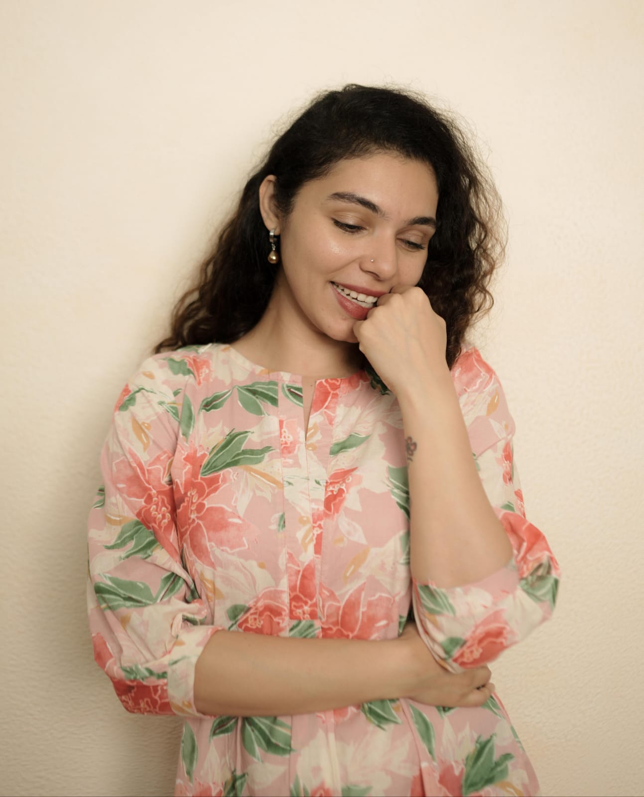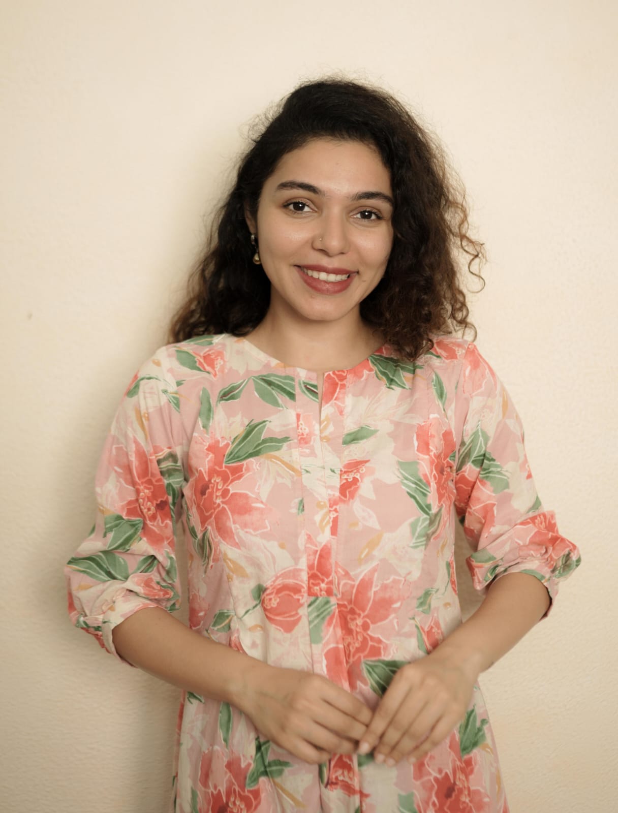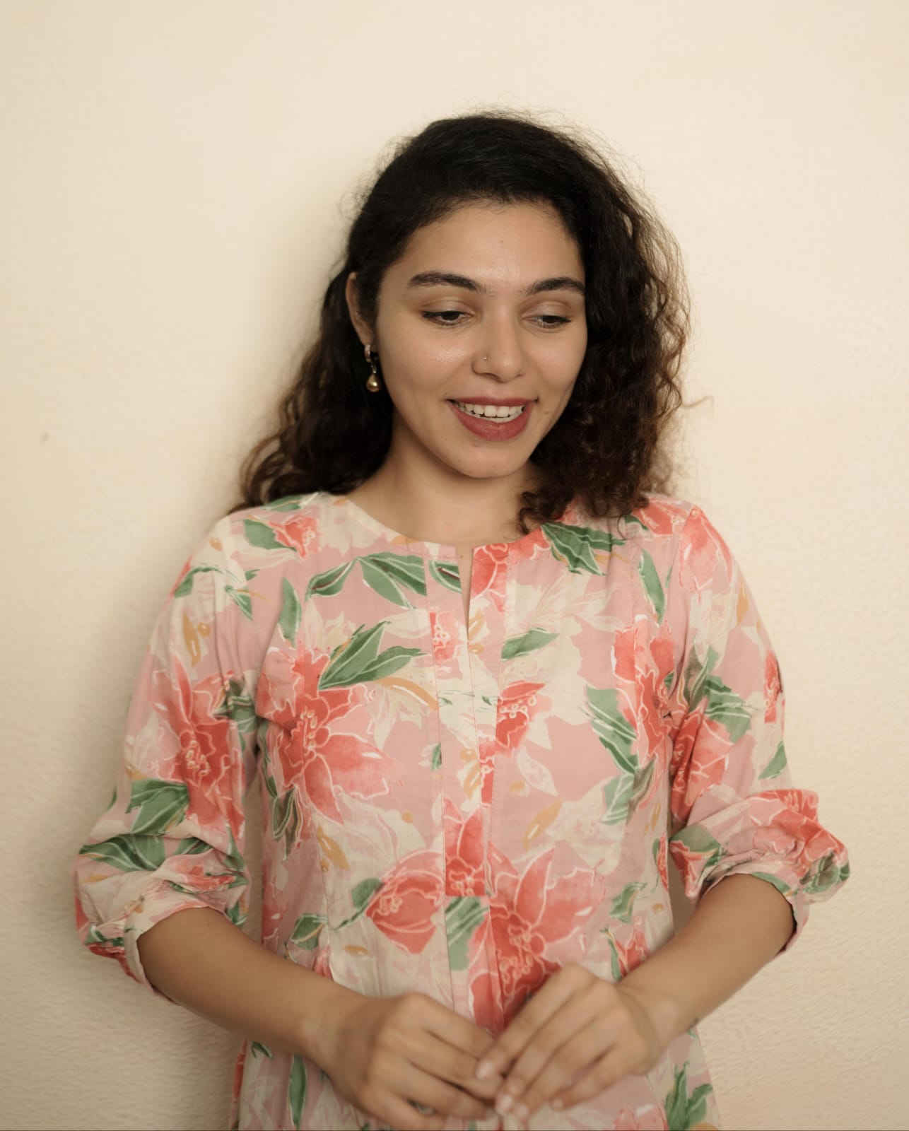 Floral Printed Cotton A Line Kurti. High neck with V-slit. Inverted Pleat on Yoke. Pleats on sleeve end. Feeding Zip Placed on the yoke. (2 invisible Zips).