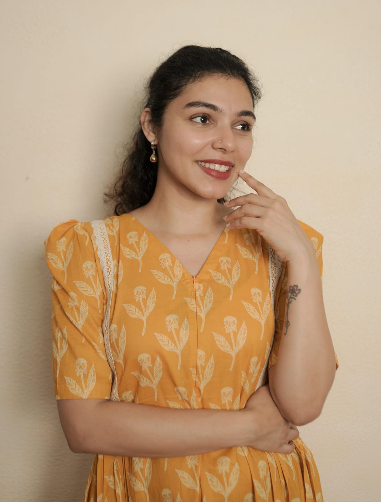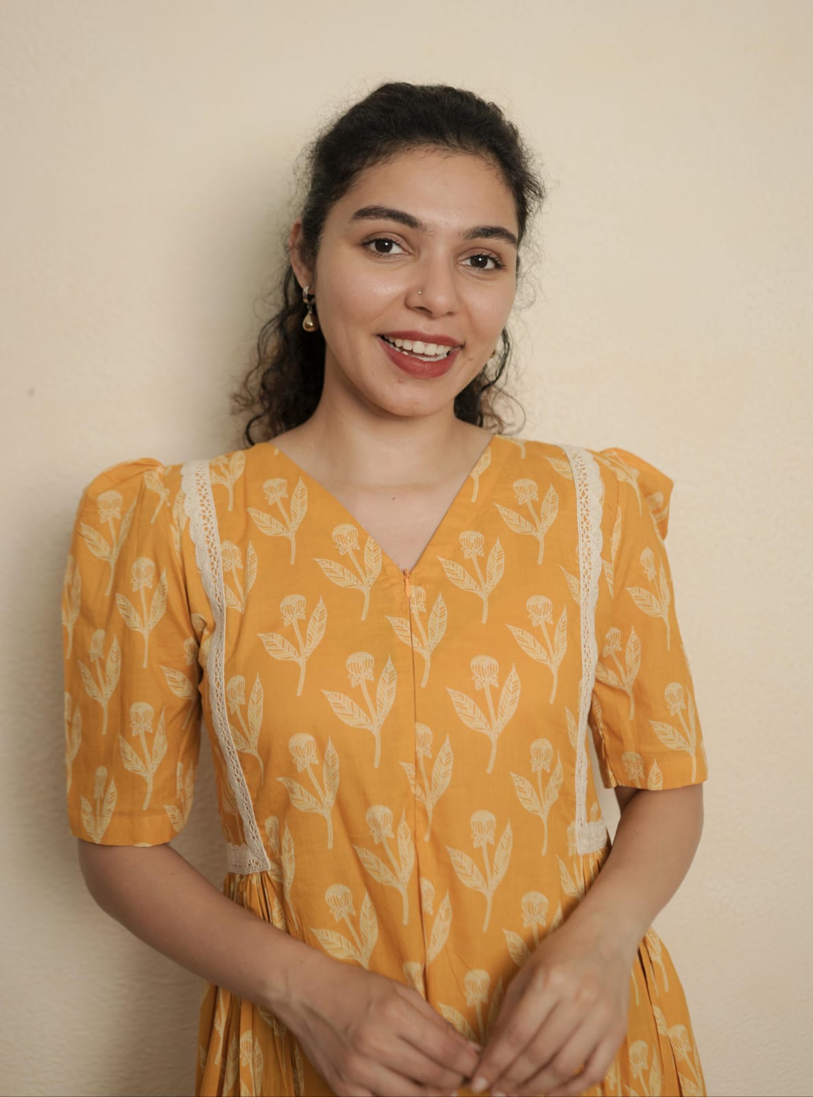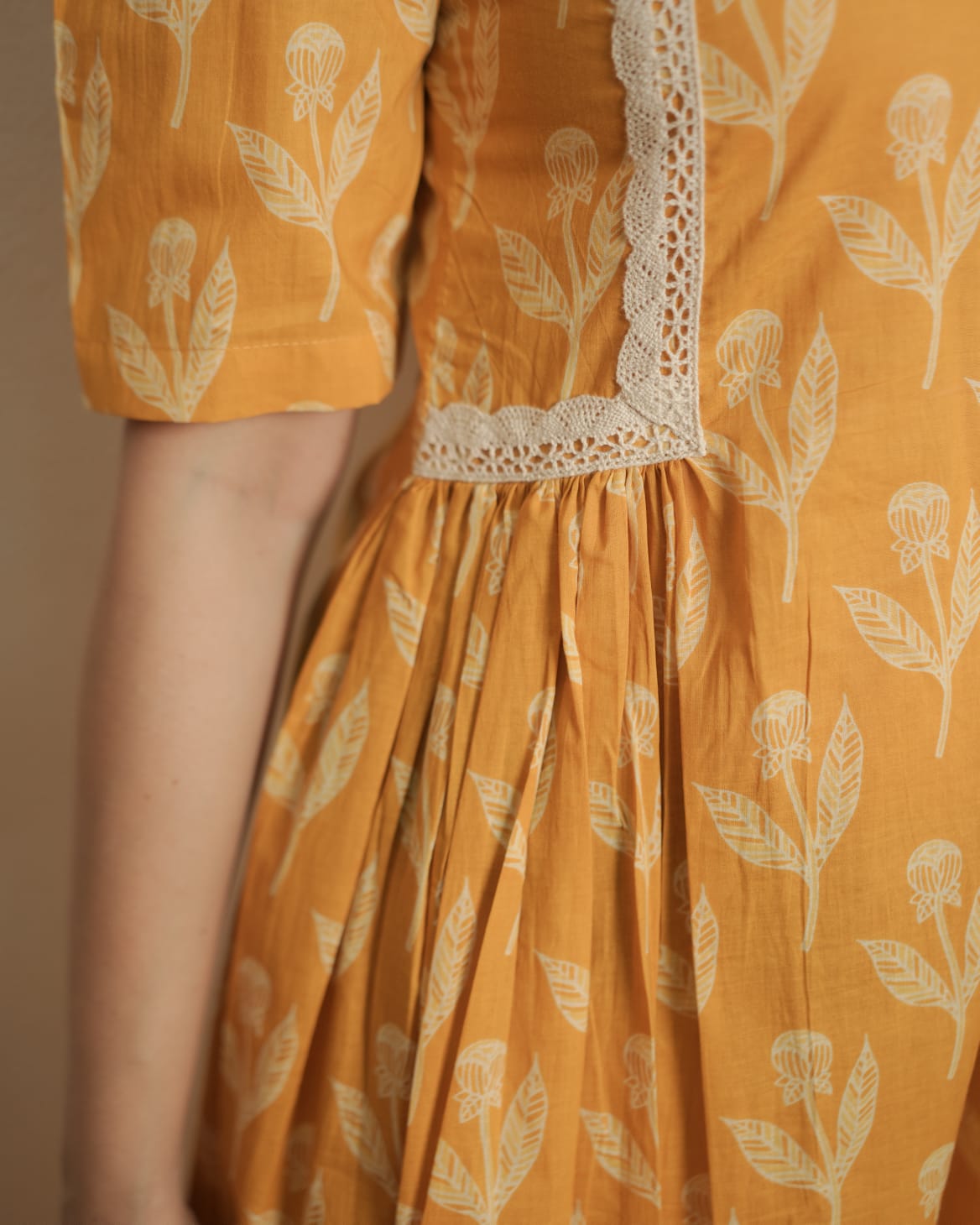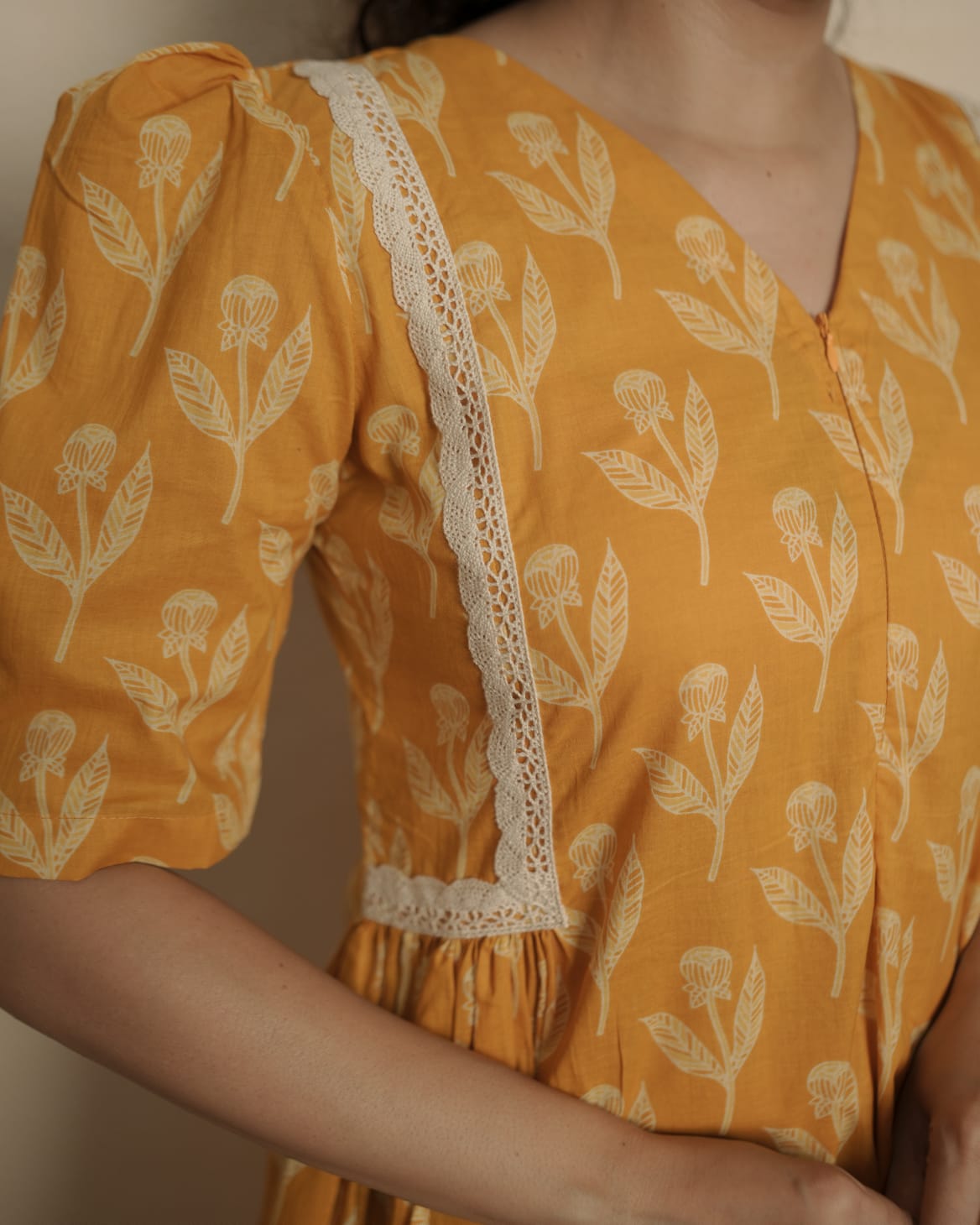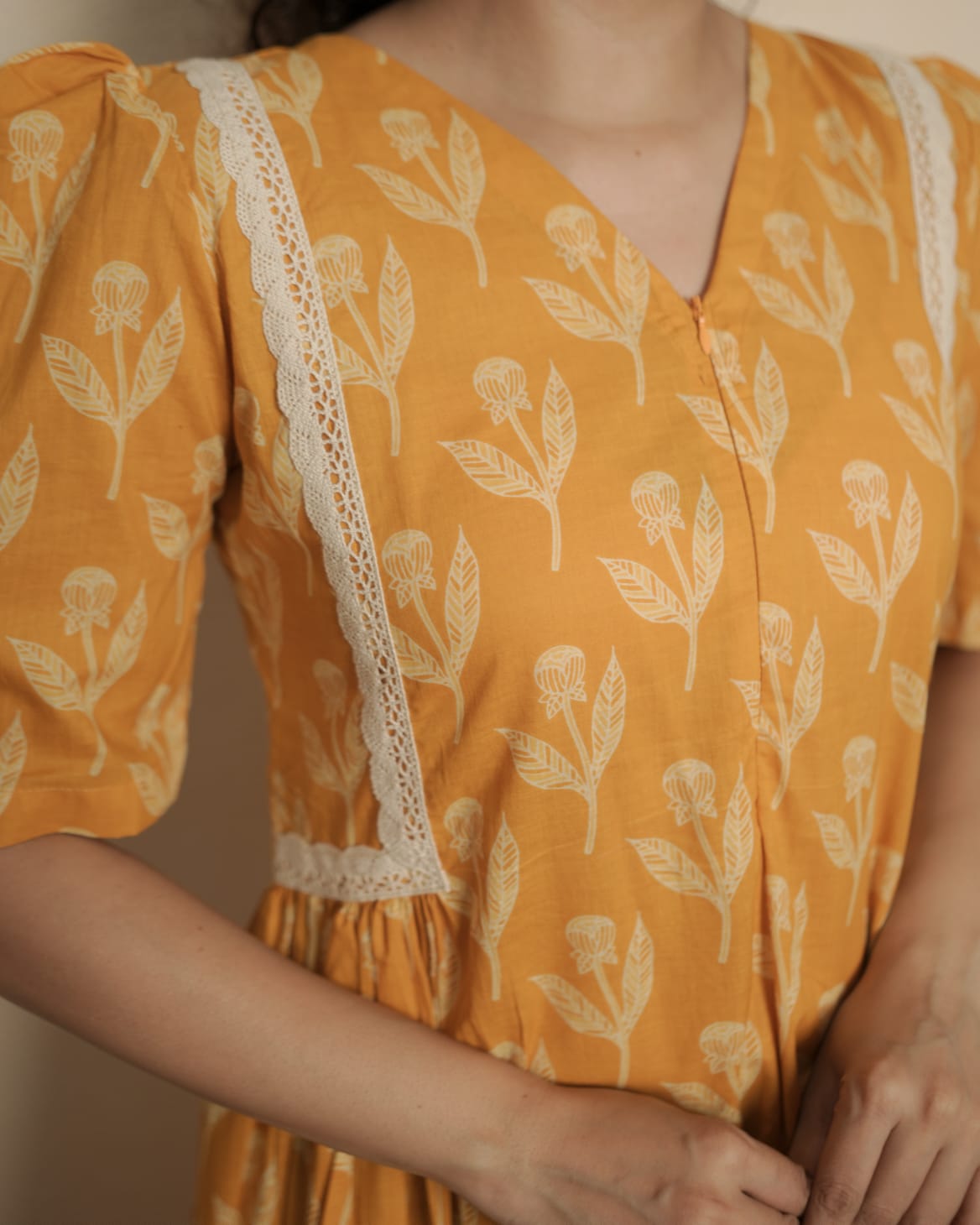Printed Cotton Dress with V-Neck. Gathers and laces on Two Sides of Waist. Elbow sleeve with puff. Feeding Zip Placed on the yoke. (1 invisible Zip).