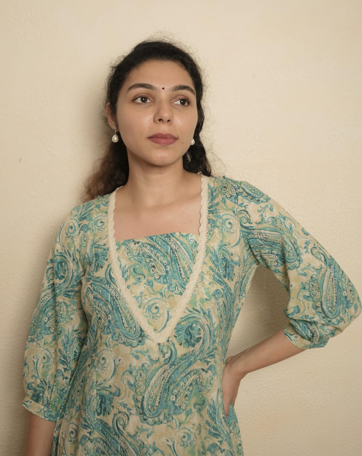 Color:- light beige base with teal and turquoise paisley prints.