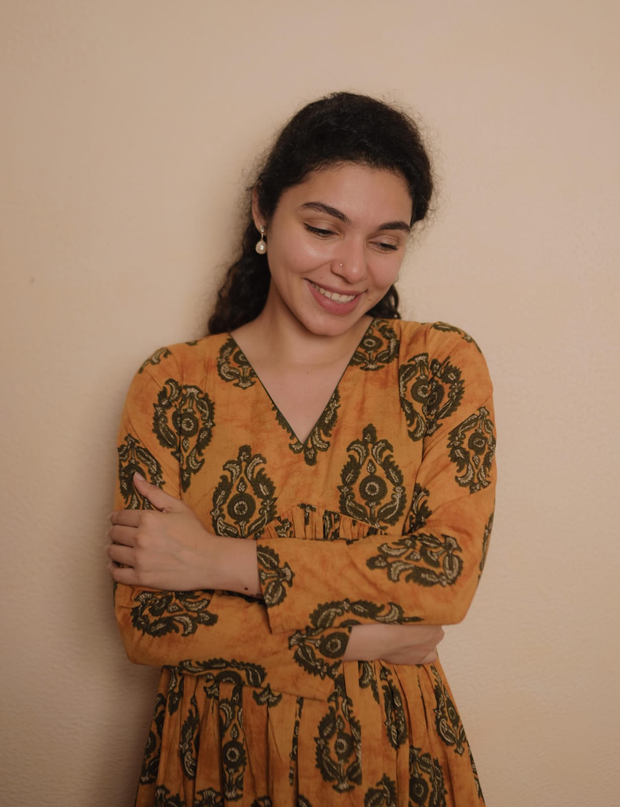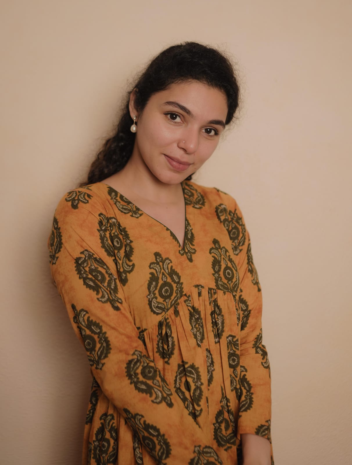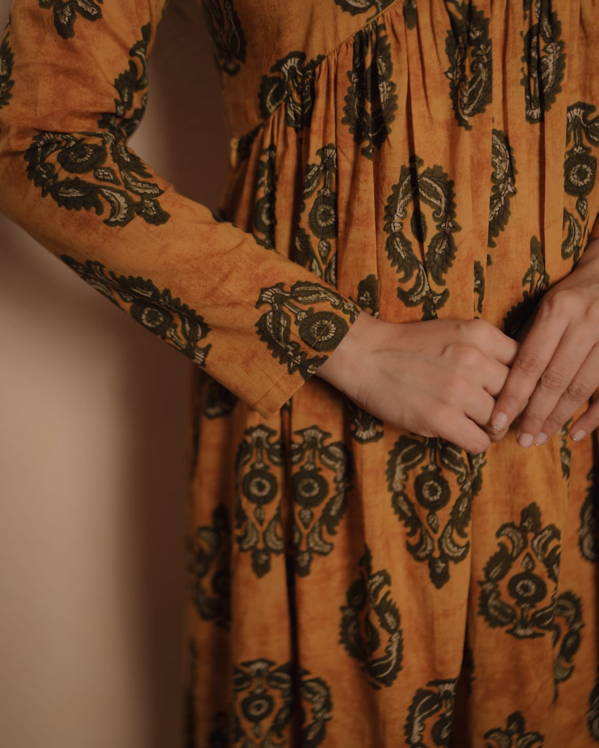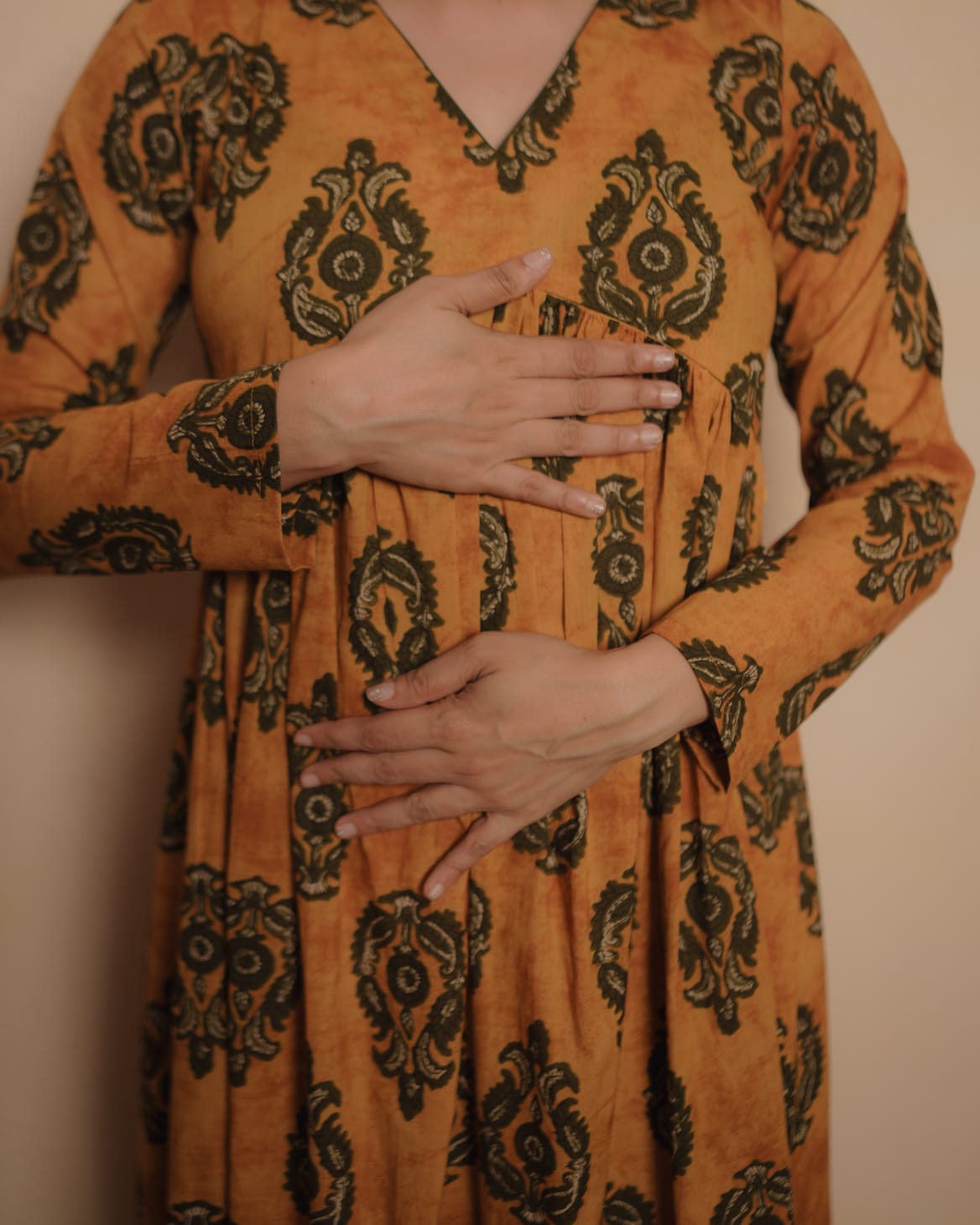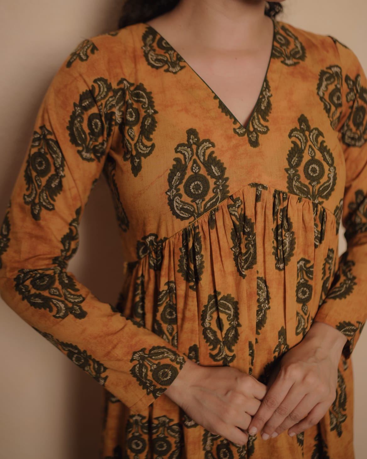 Alia Cut Cotton Dress with Full sleeve. Gathers on Yoke and V Neck.