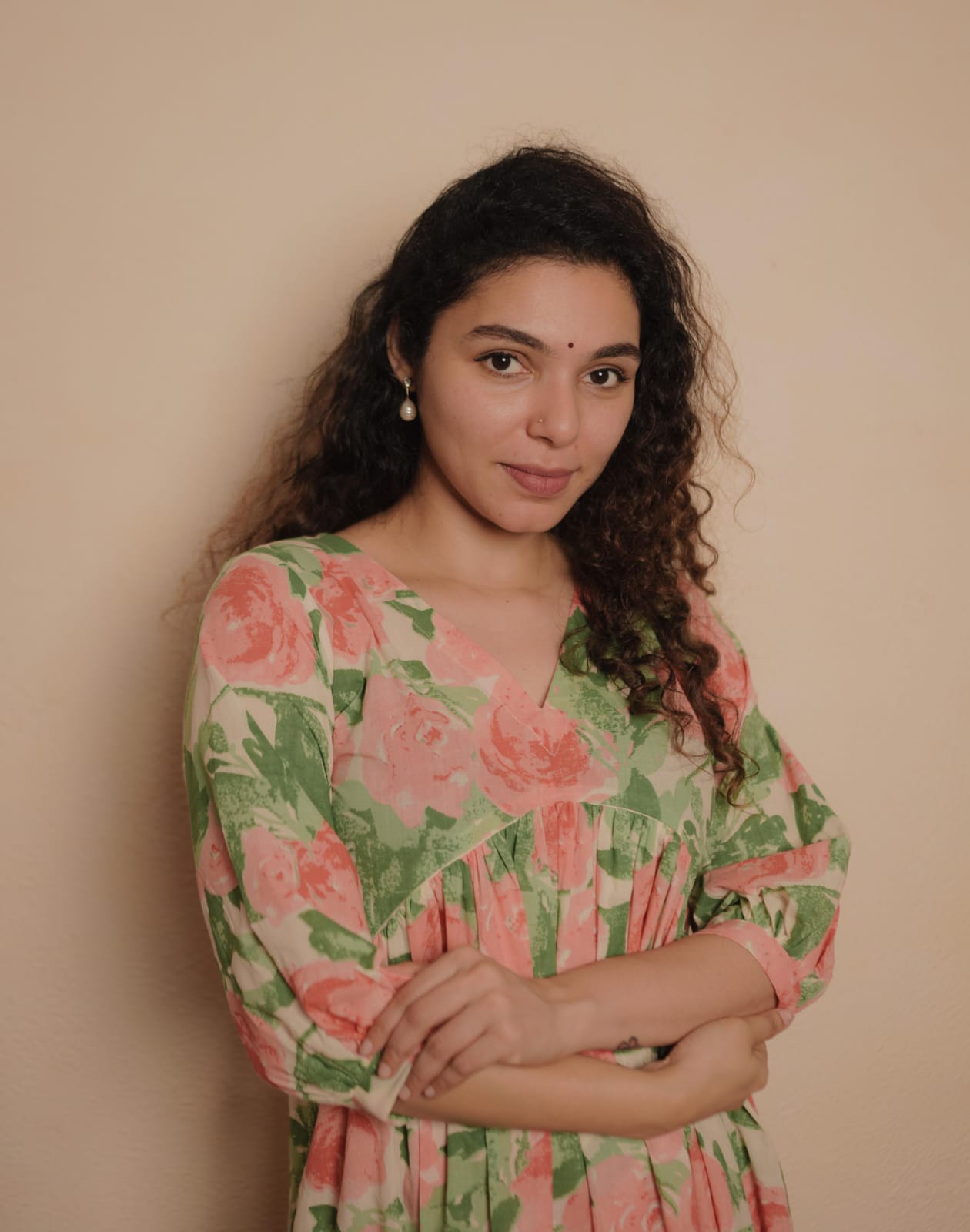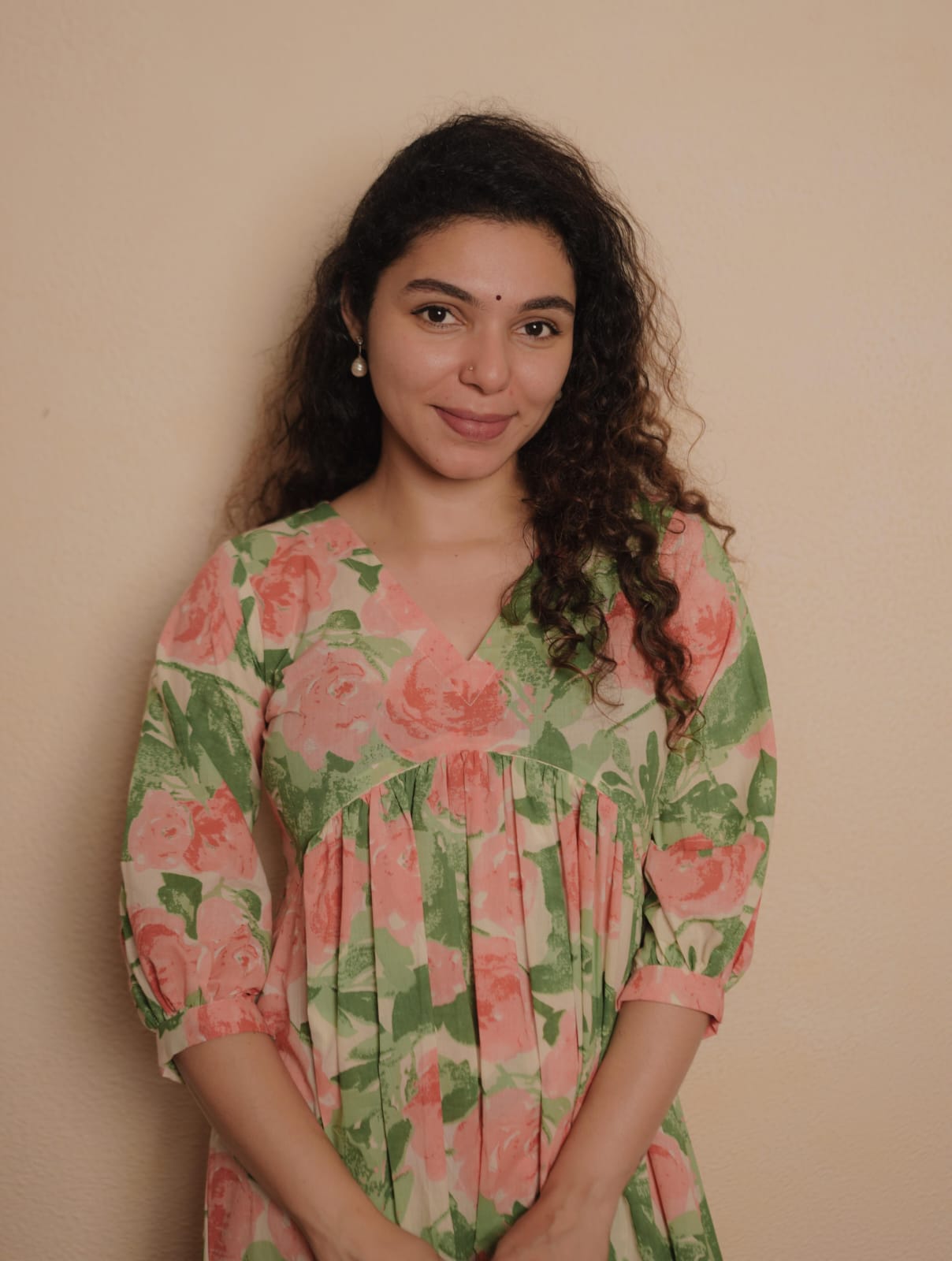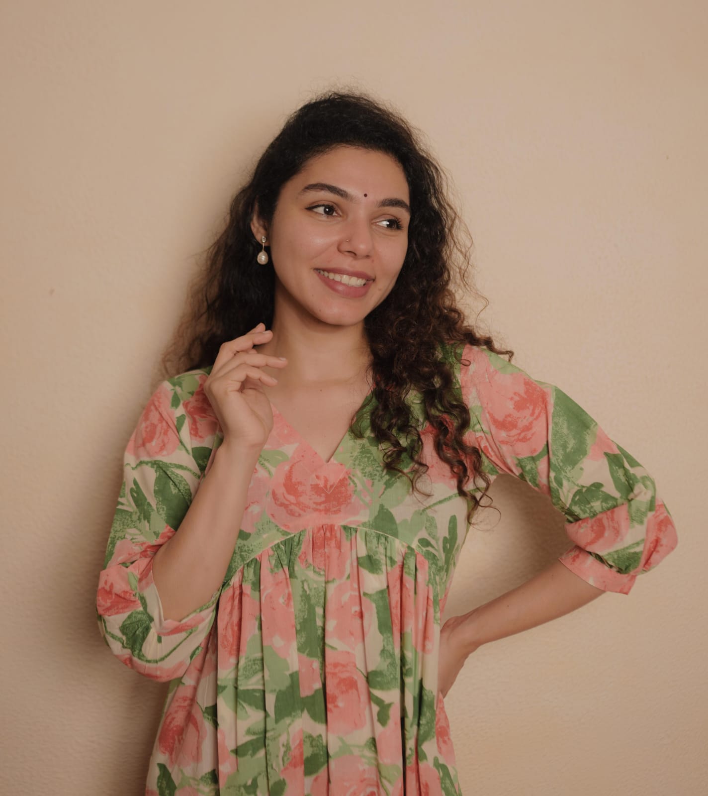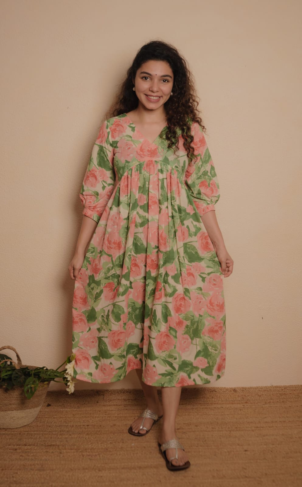 Alia Cut Cotton Dress with V Neck. Gathers on Yoke. Pleats on sleeve end. Feeding Zip Placed across the yoke. ( 2 invisible Zips)
