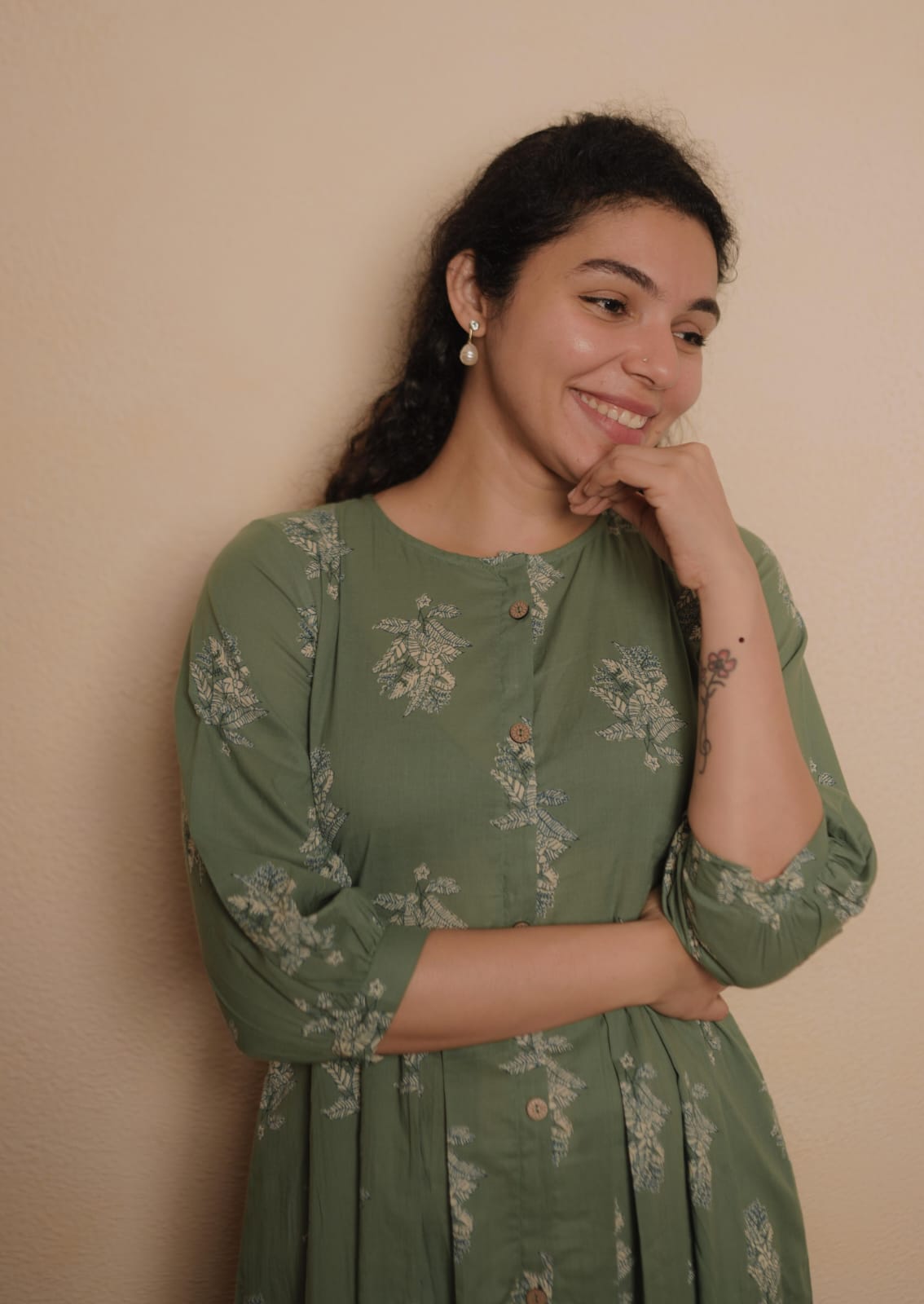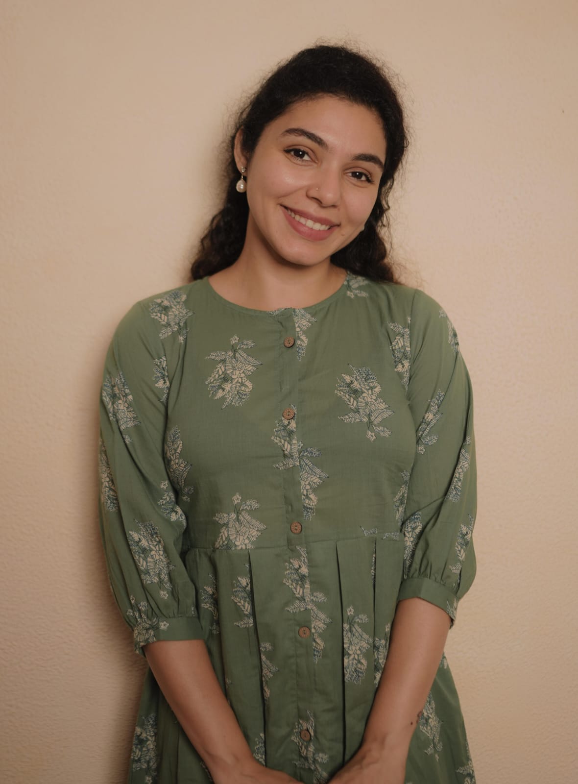 Printed Cotton A-Line Dress with Round neck. Buttons added for detailing. Pleats on Yoke. Front open (for feeding) with hook.