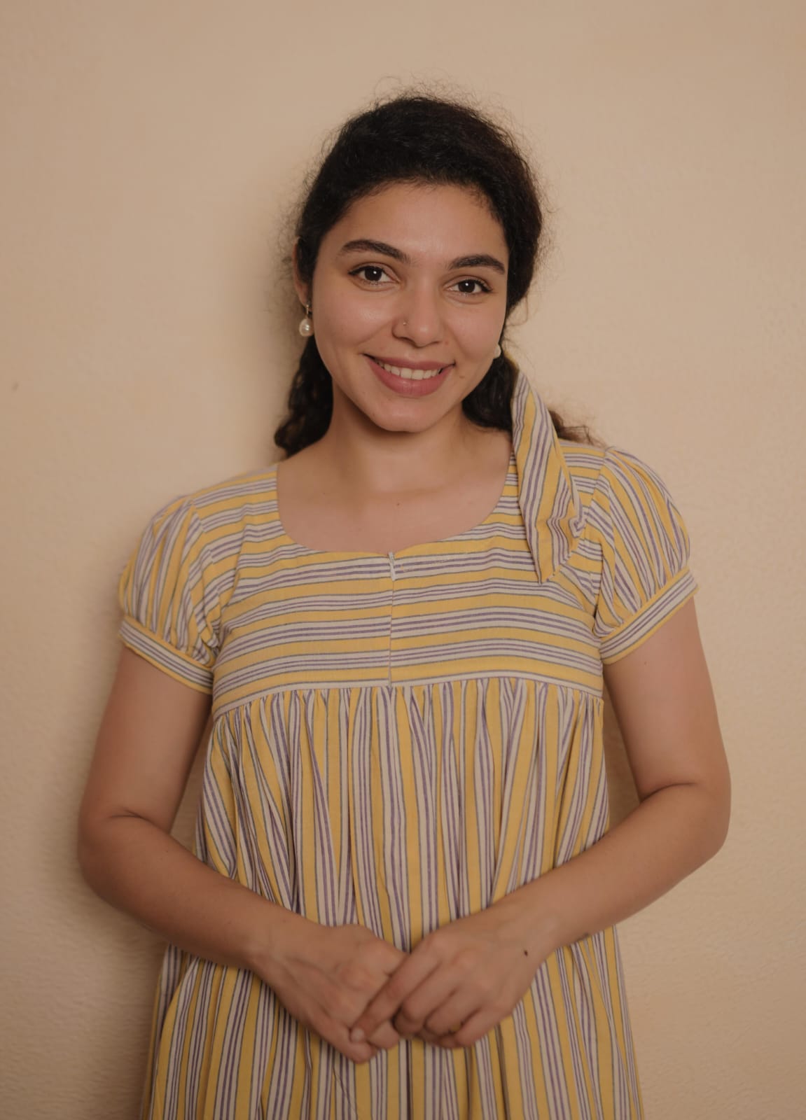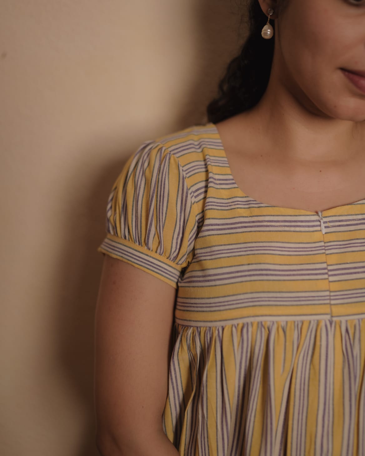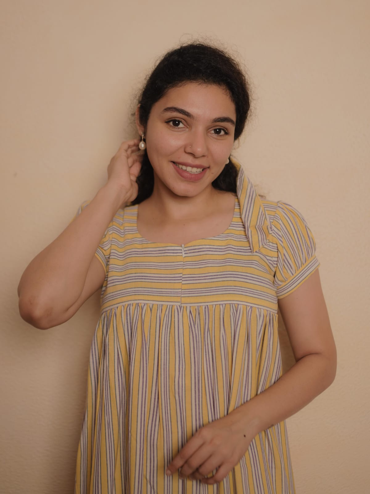 Stripes Cotton A line Dress with Round Neck. Puff sleeves added. Gathers on Yoke. Feeding Zip Placed on the yoke. (1 invisible Zip).
