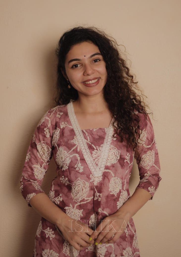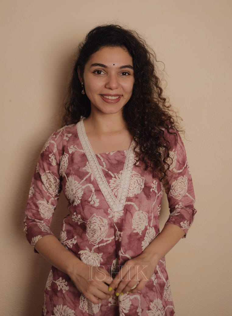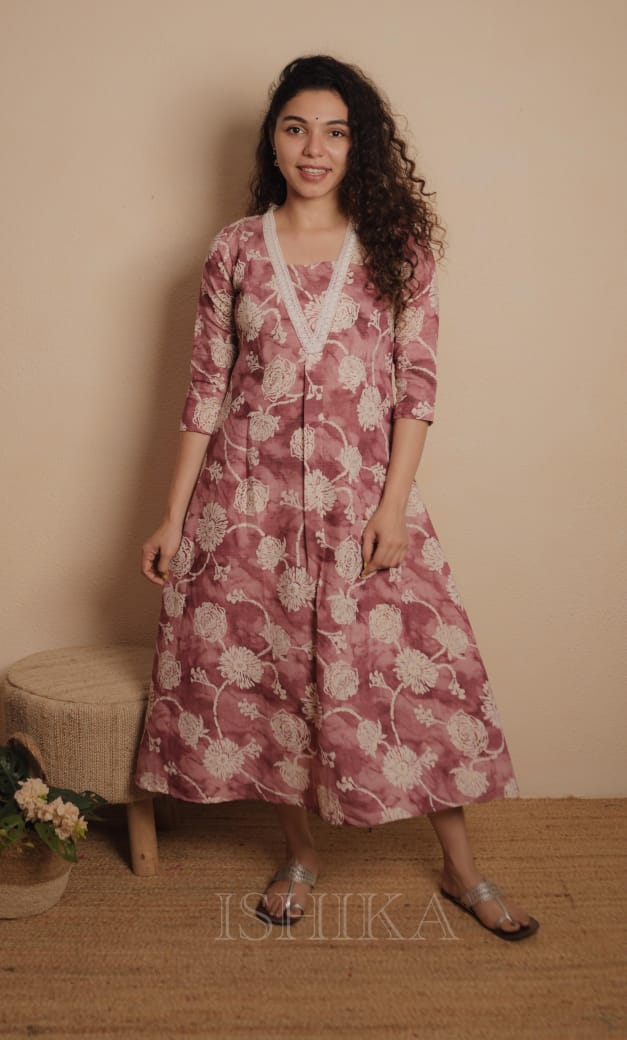 Printed Muslin Silk A-Line Dress with V-Neck. Inverted Pleat on Yoke. Lace on neck. Feeding Zip Placed on the yoke. (2 invisible Zips).