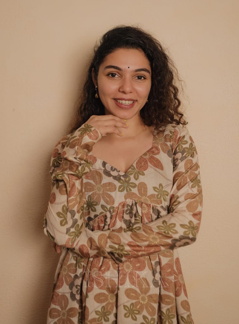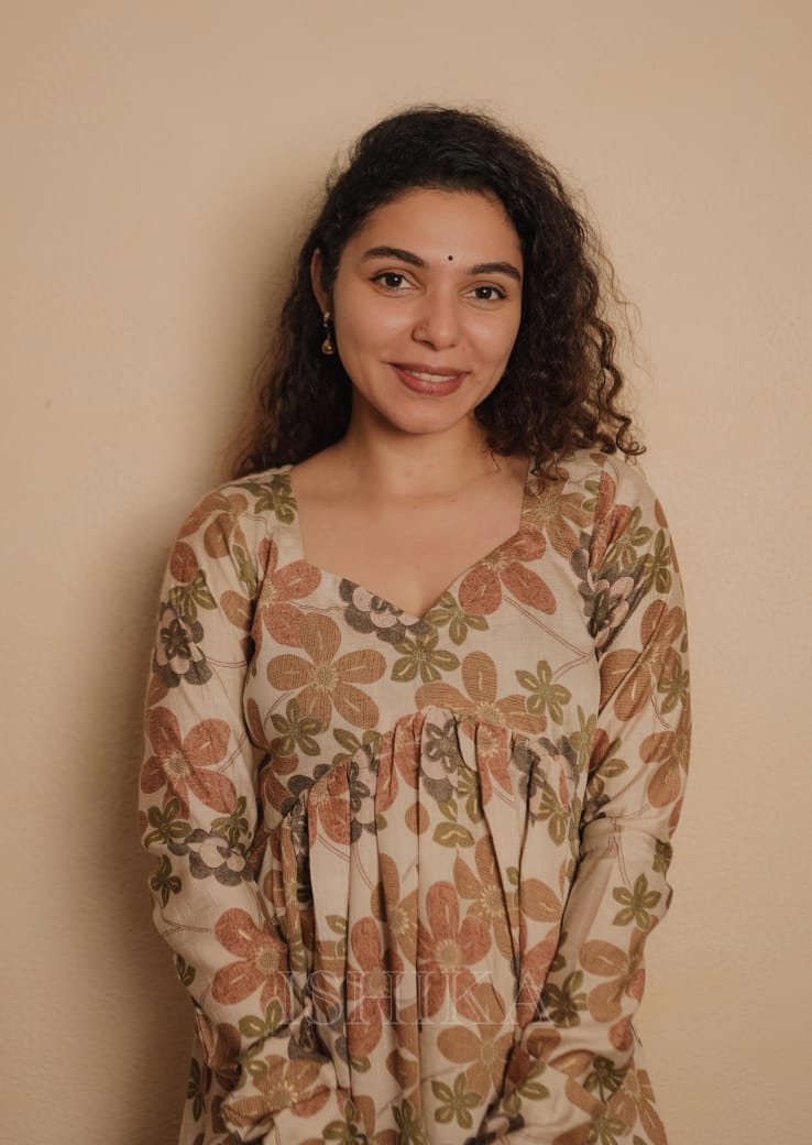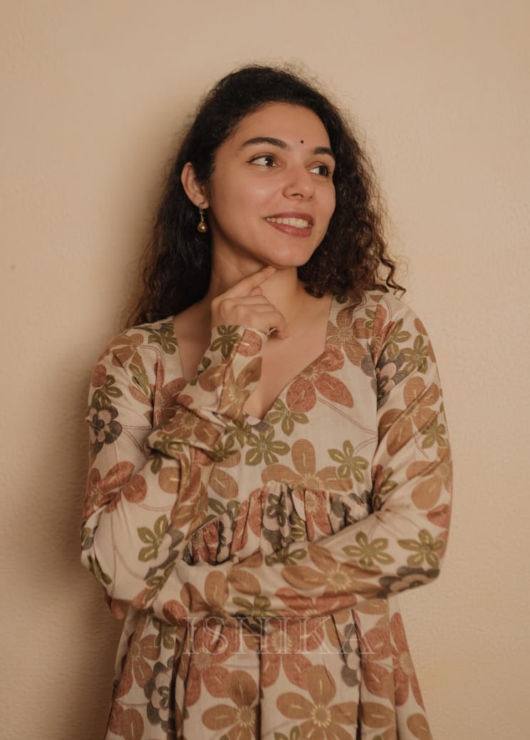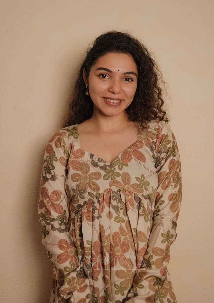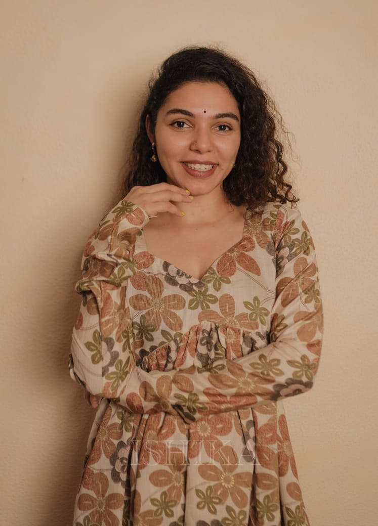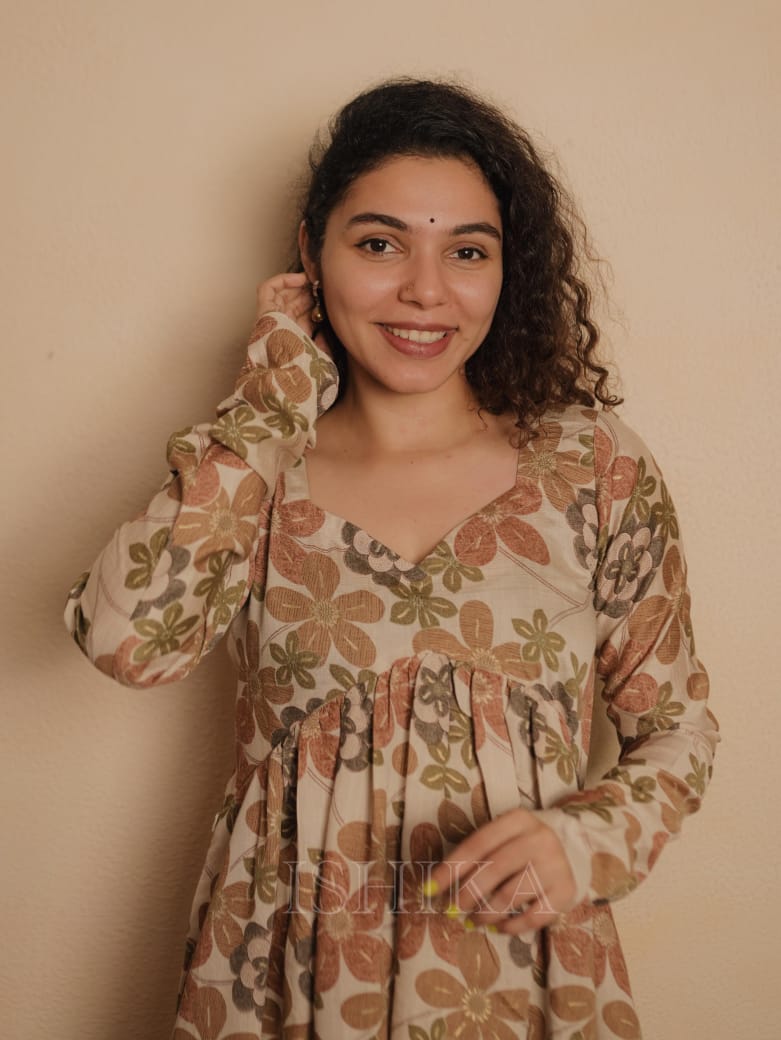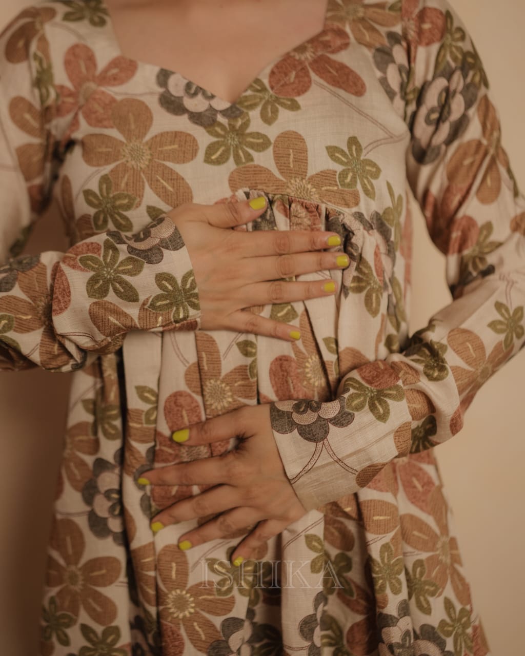 Floral Printed Muslin Silk Alia Cut dress with Sweet Heart Neck. Gathers on yoke. Churi Sleeve. Feeding Zip Placed across the yoke. ( 2 invisible Zips).