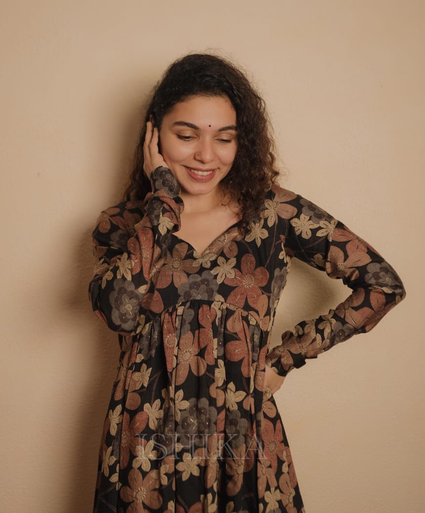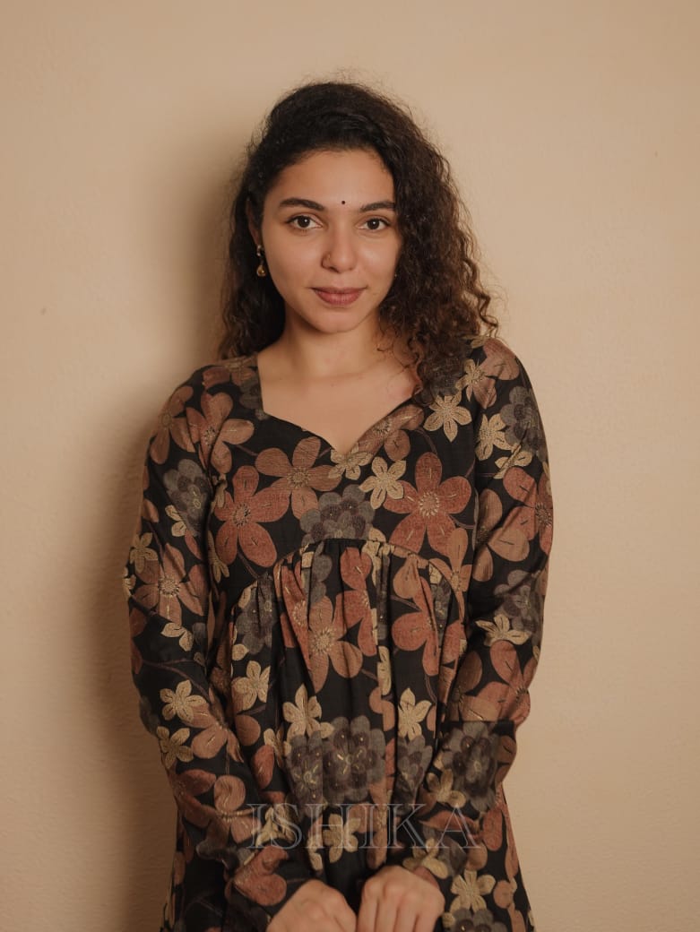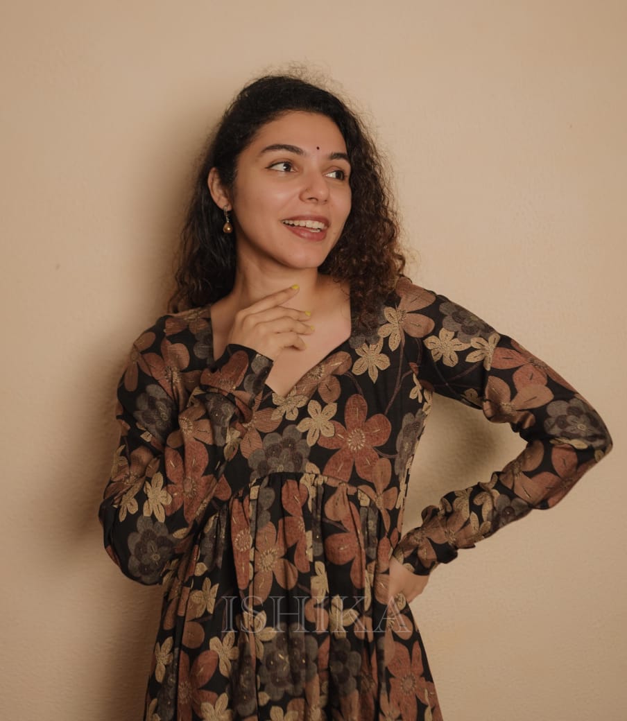 Alia Cut Muslin Silk Dress with Churi sleeves. Gathers on Yoke. Sweet Heart Neck added.