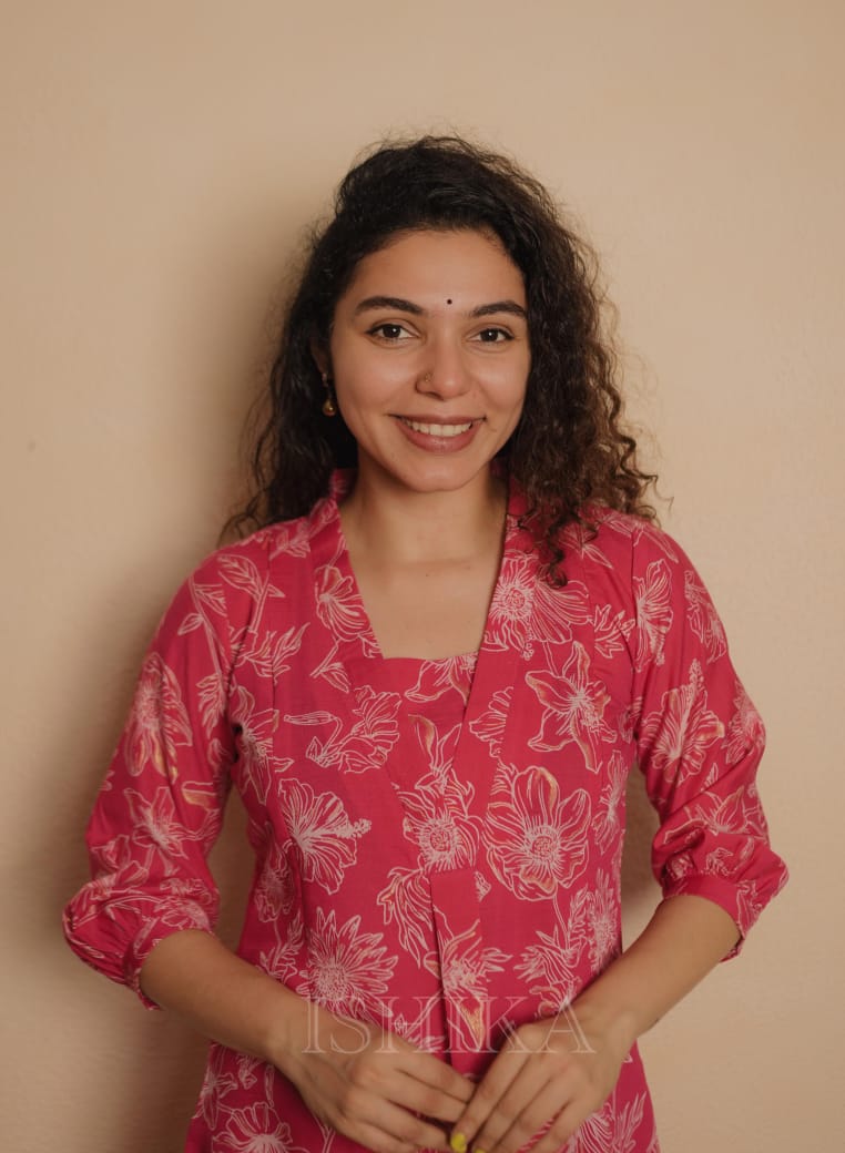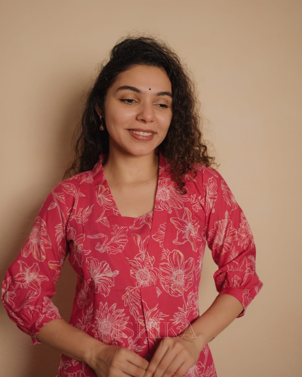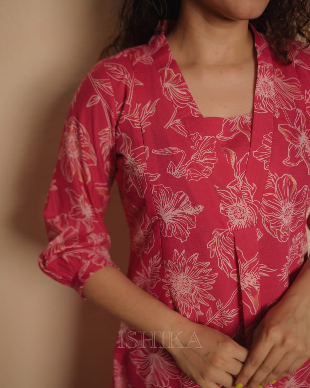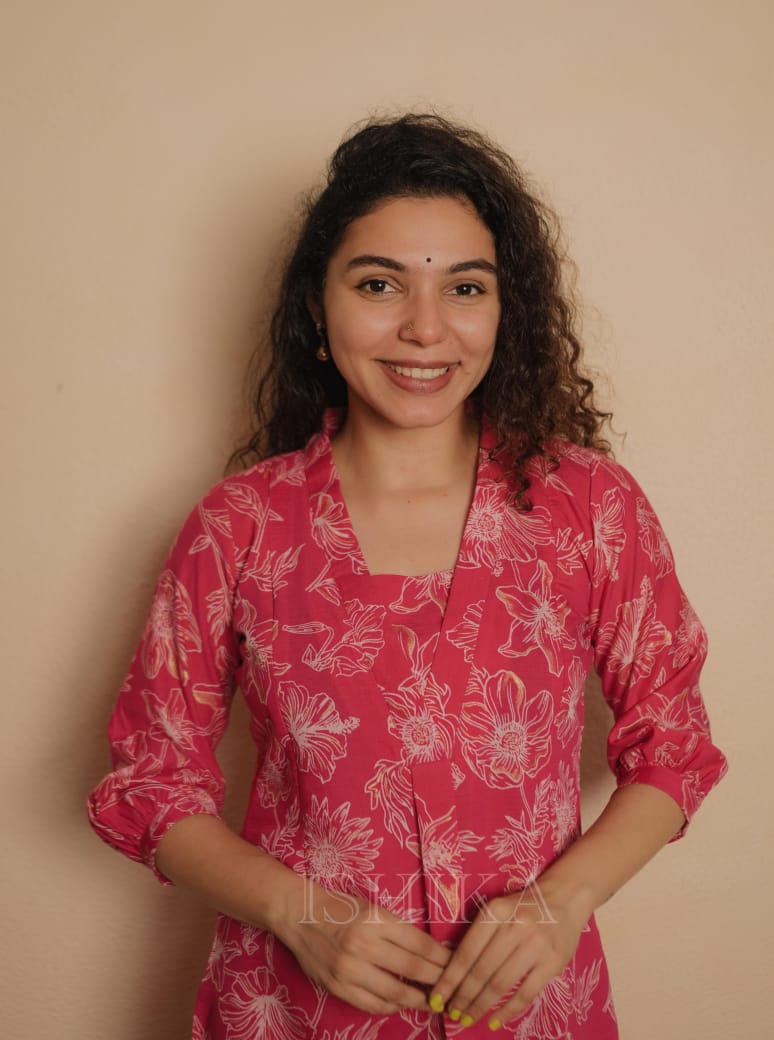 Printed Muslin Silk A-Line Dress with V-Neck. Inverted Pleat on Yoke. Pleats on sleeve end. Feeding Zip Placed on the yoke. (2 invisible Zips).
