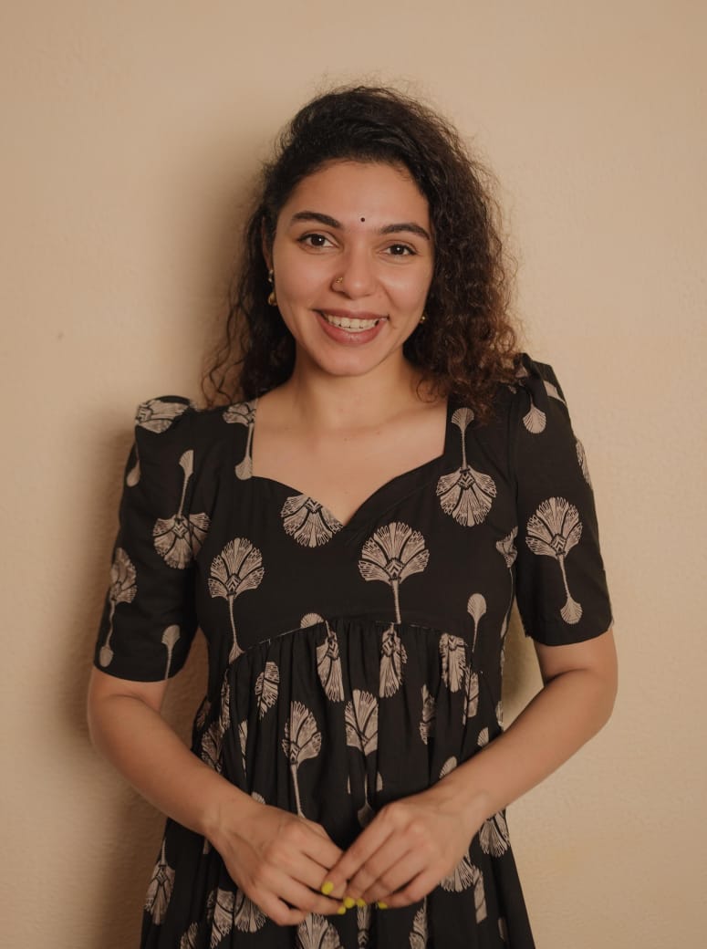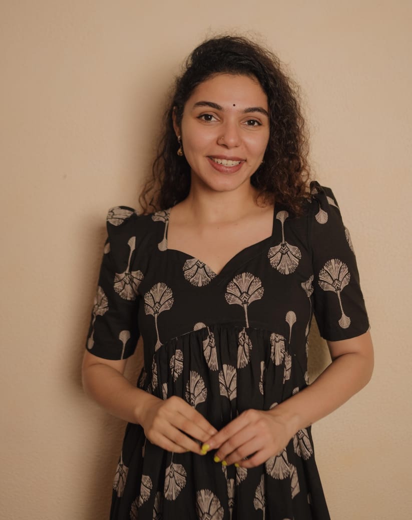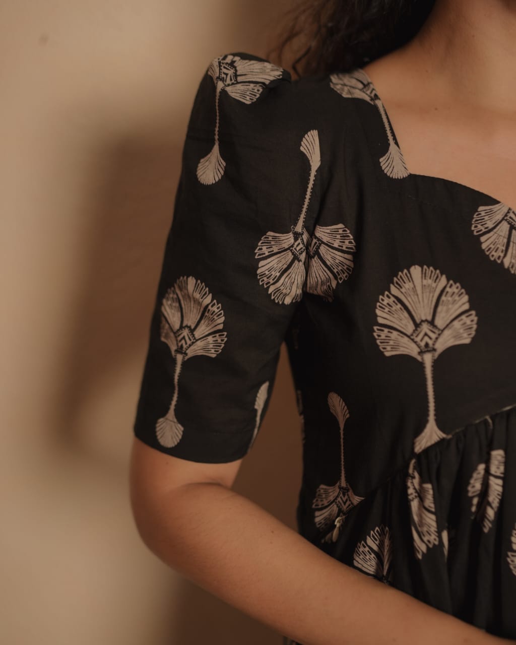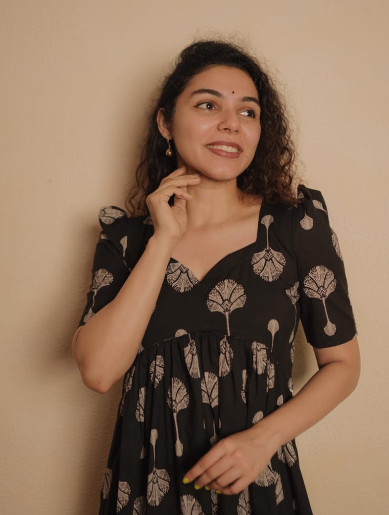 Alia Cut Cotton Dress with Sweet Heart Neck. Gathers on Yoke. Elbow sleeve with puff on top. Feeding Zip Placed across the yoke. ( 2 invisible Zips)