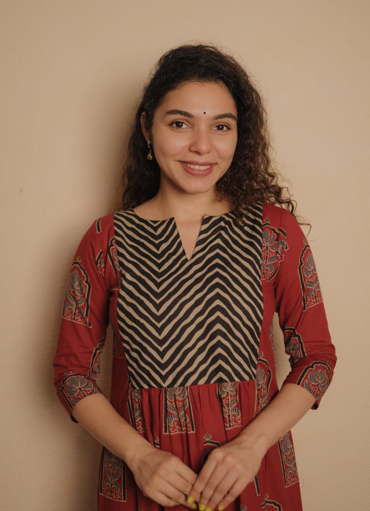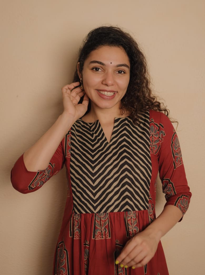 Cotton A-line Dress with Zig Zag pattern yoke. Round neck with slit. Gathers on Yoke.