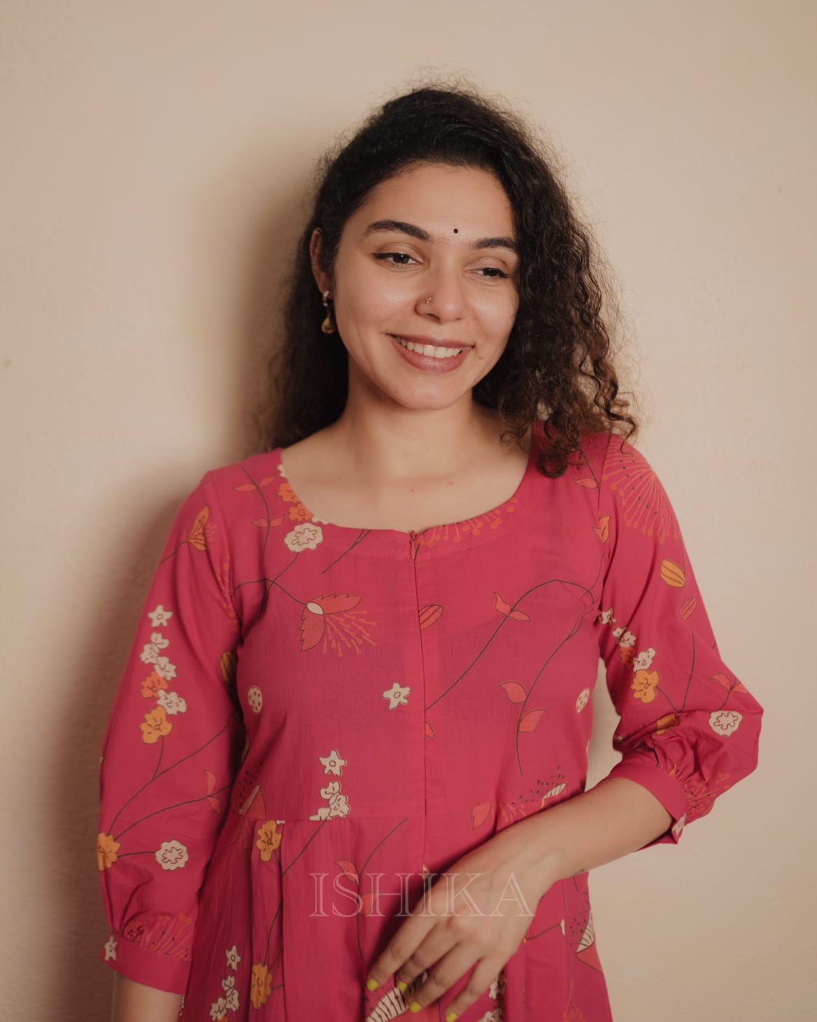 Printed Cotton A Line Kurti with Pleats added on waist. Pleats on sleeve end. Feeding Zip Placed on the yoke. (1 invisible Zip).