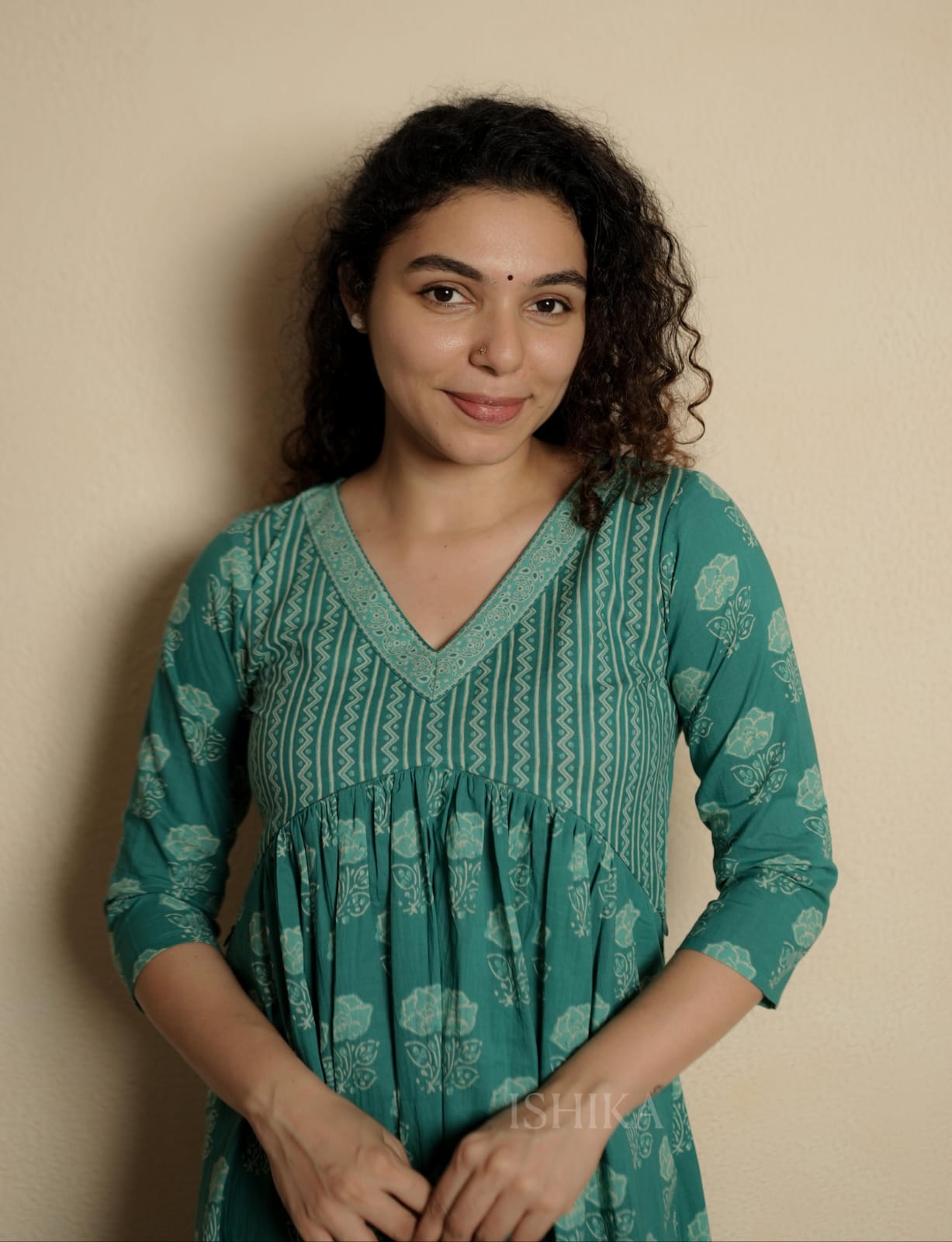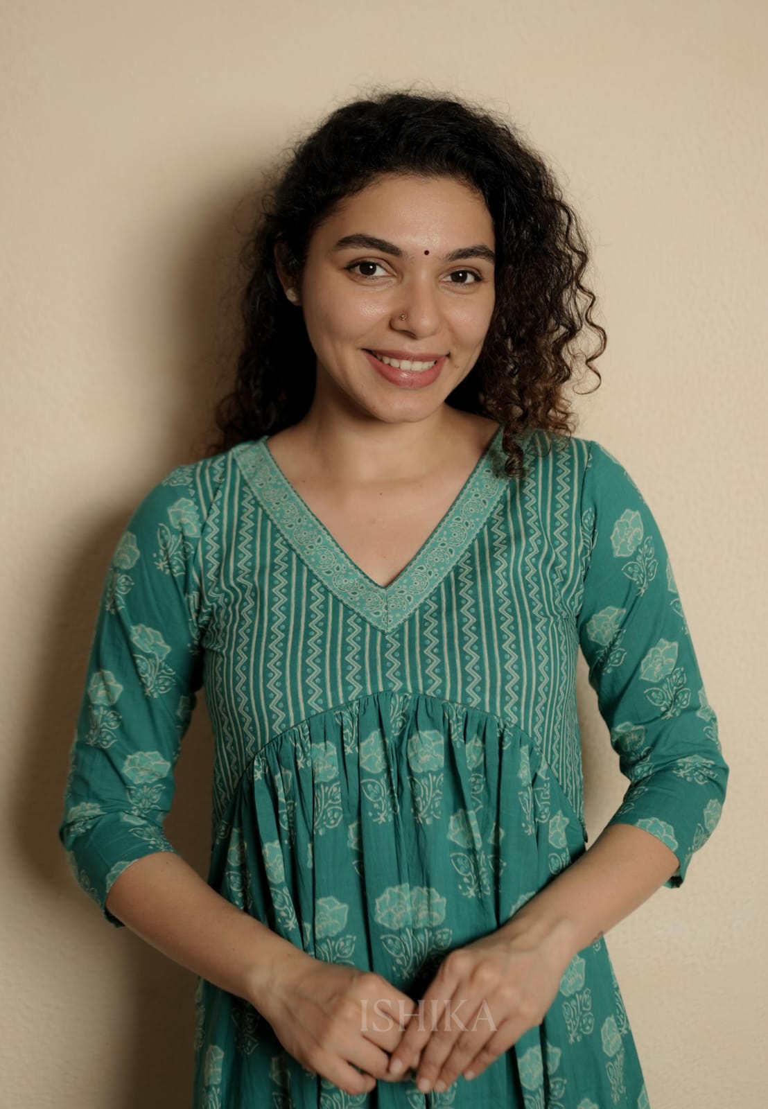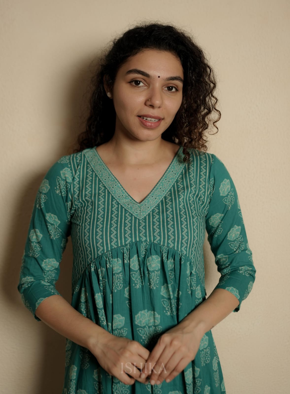 Alia Cut Cotton Dress with V Neck. Gathers on Yoke. Feeding Zip Placed across the yoke. ( 2 invisible Zips)