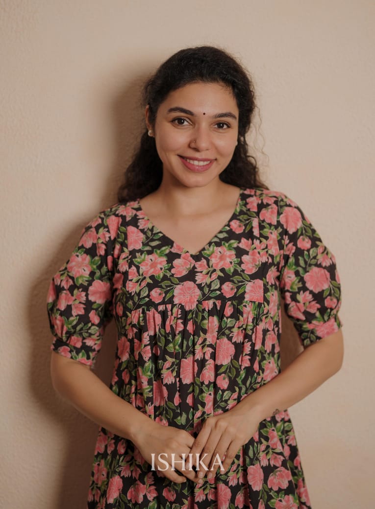 A-line Cotton Dress with V Neck. Gathers on Yoke. Elbow sleeve with pleats on end of the sleeves. Feeding Zips Placed on the yoke. ( 2 invisible Zips).