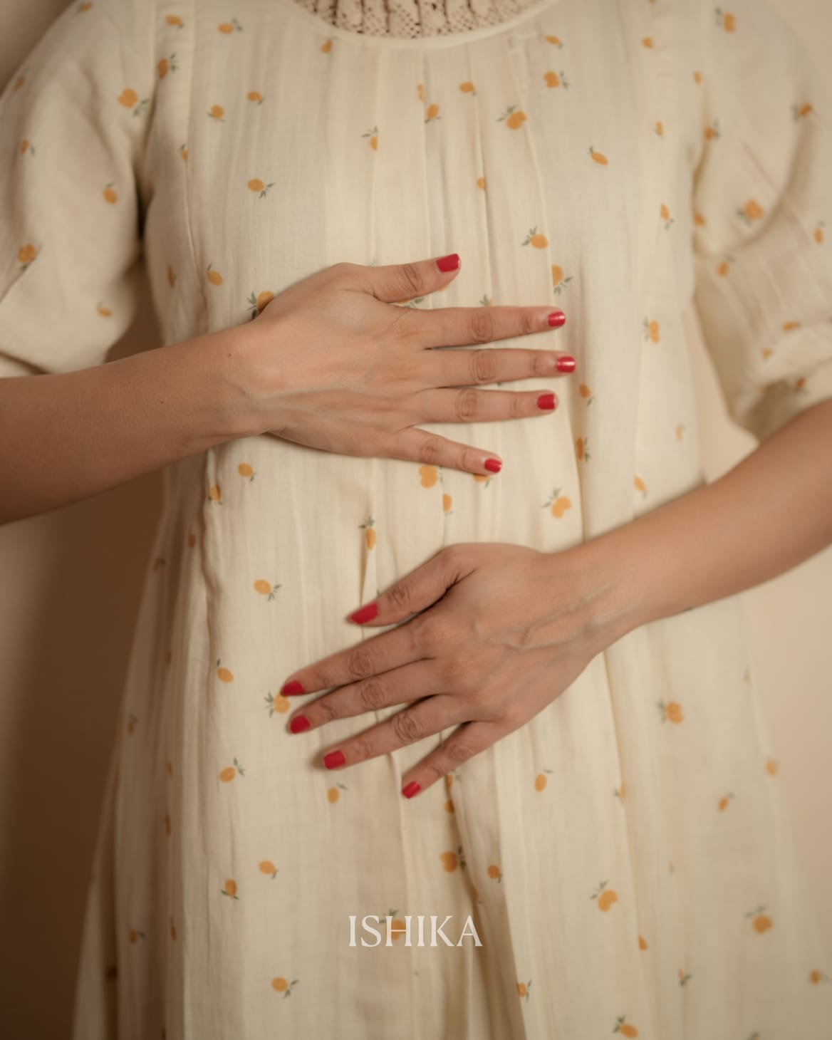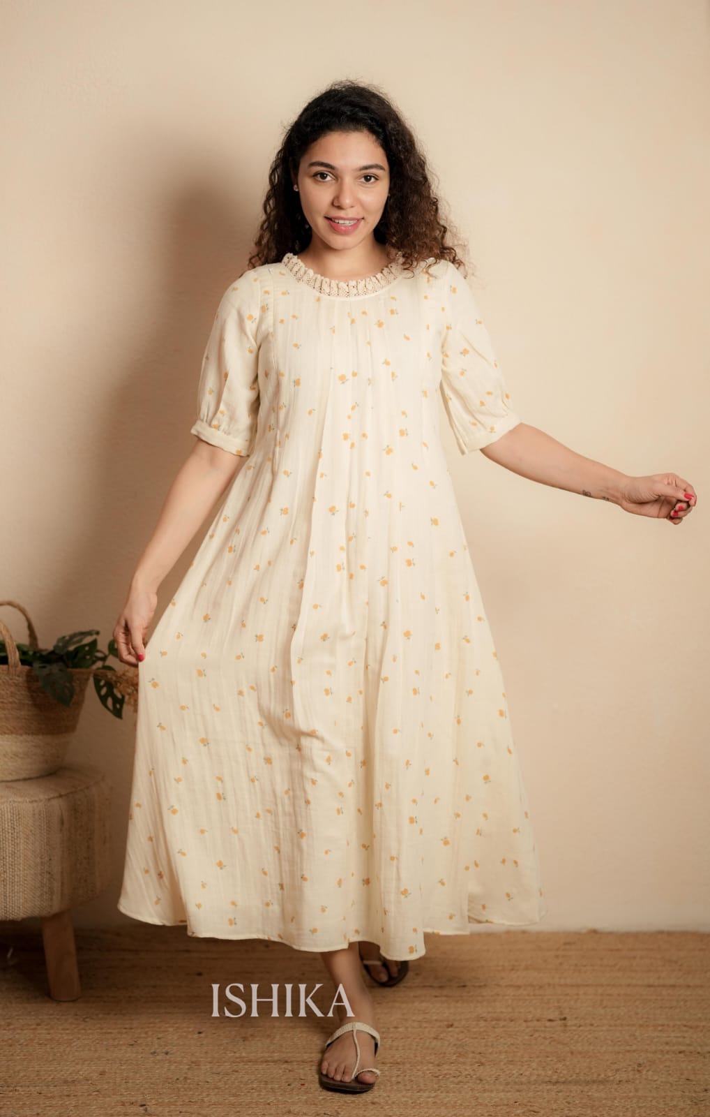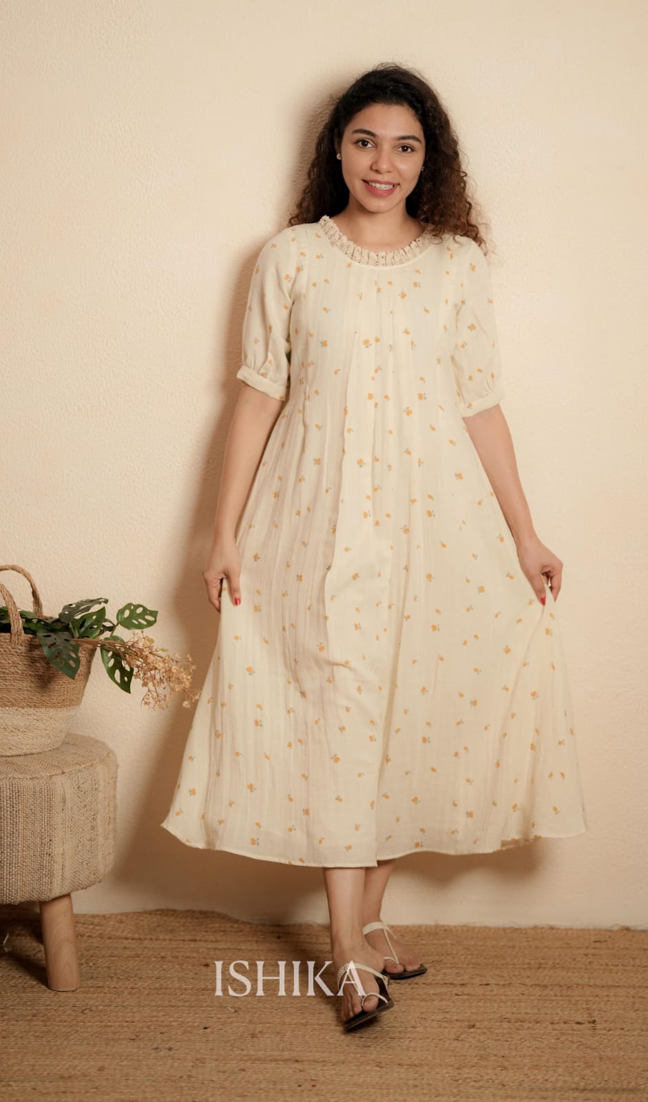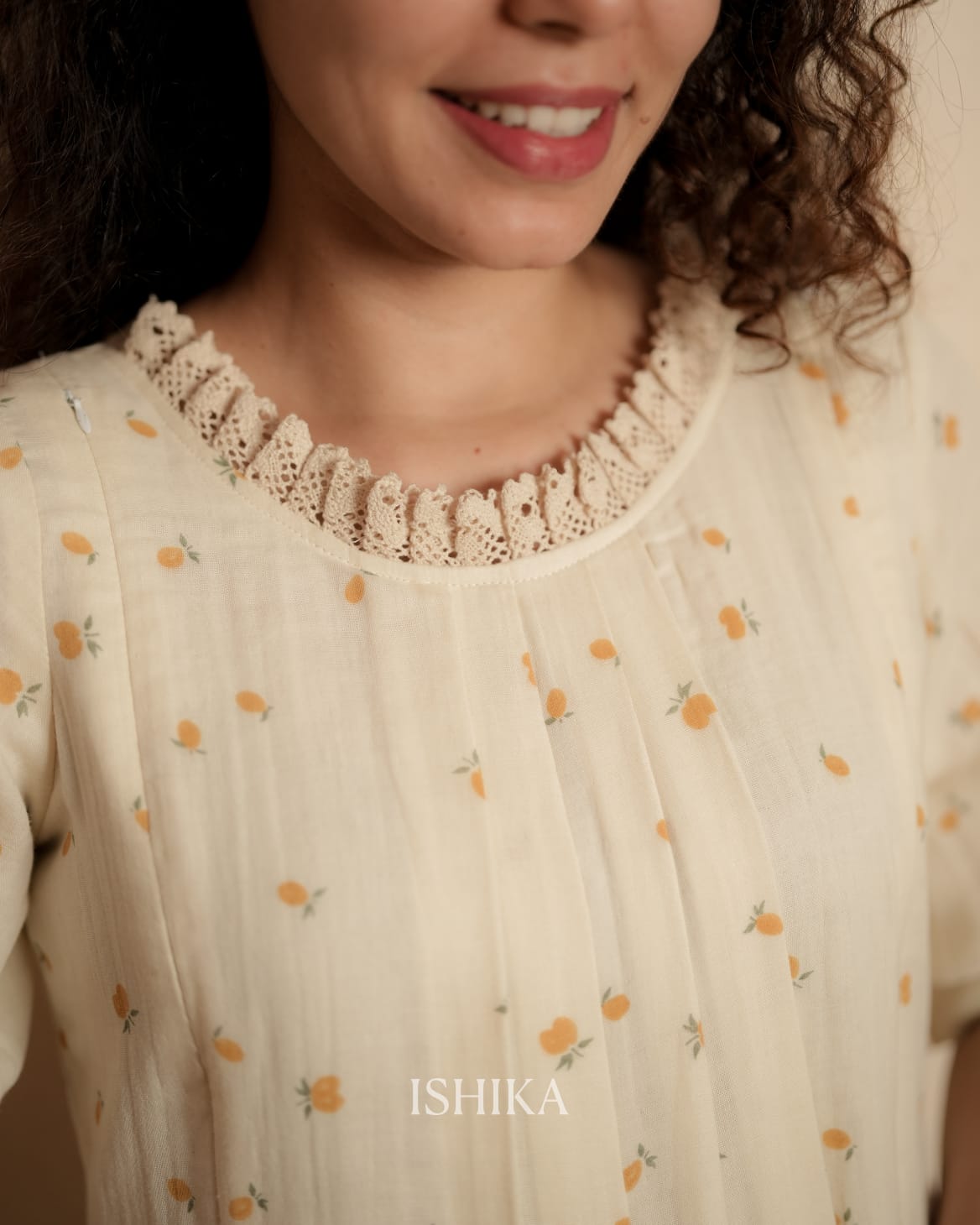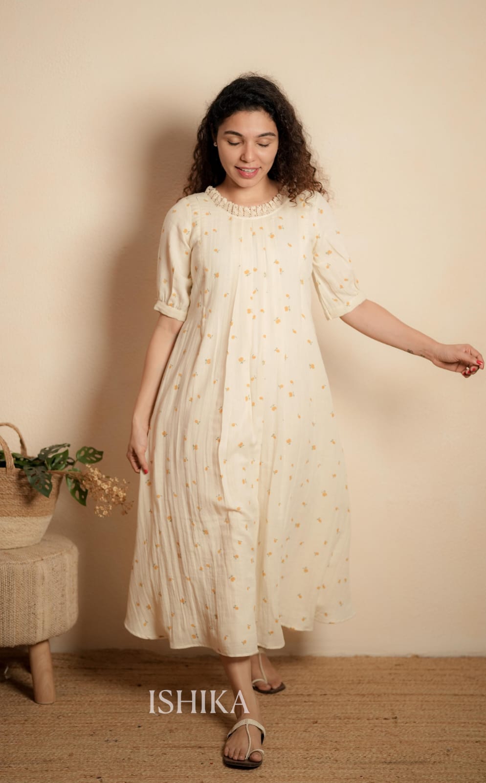 High-quality soft Cotton A-Line Dress Featuring round neck .Lace attached on neck. Pleated detailing on the Neck and pleats at the sleeve ends. Feeding Zips Placed on the yoke. (2 invisible Zips).