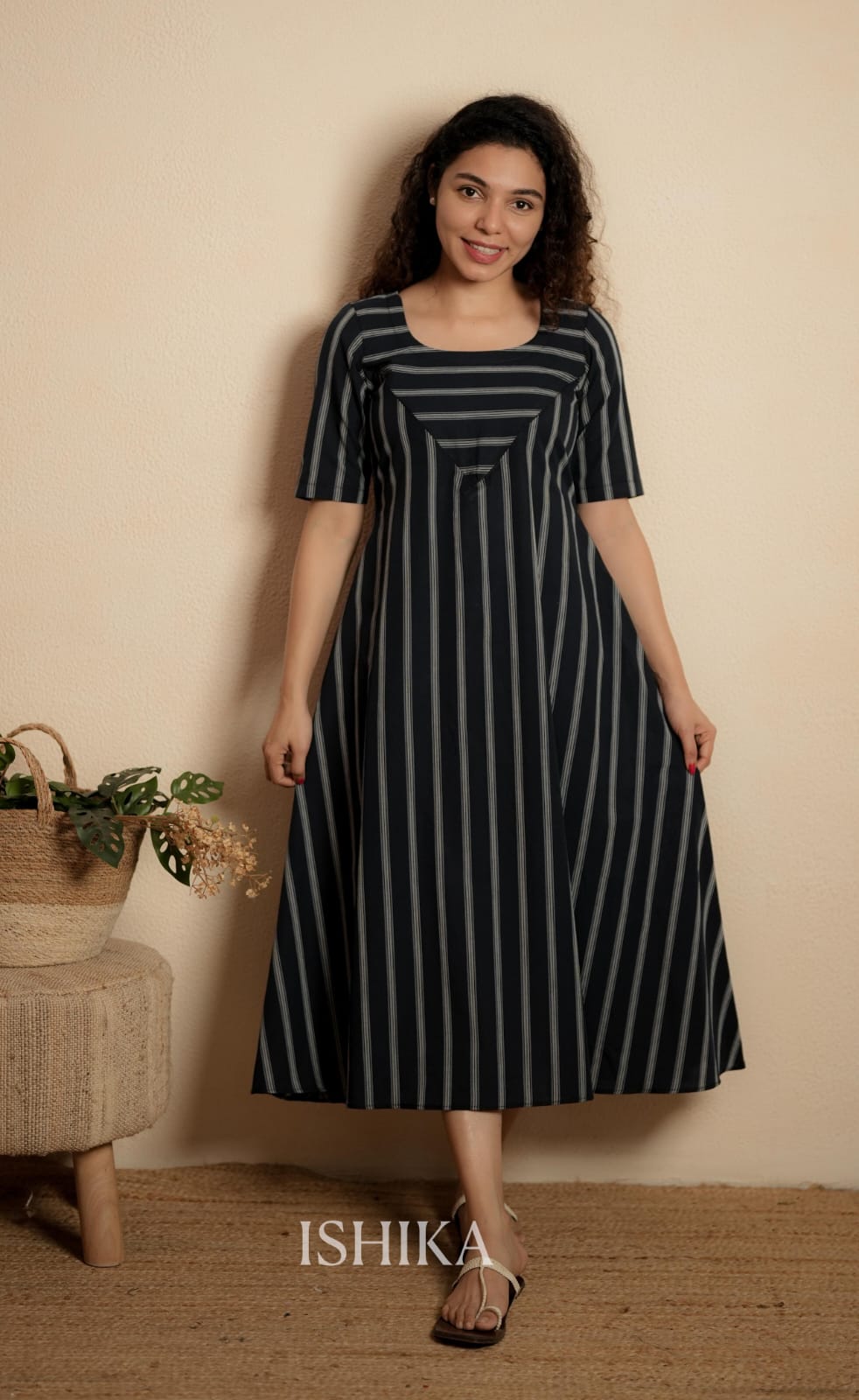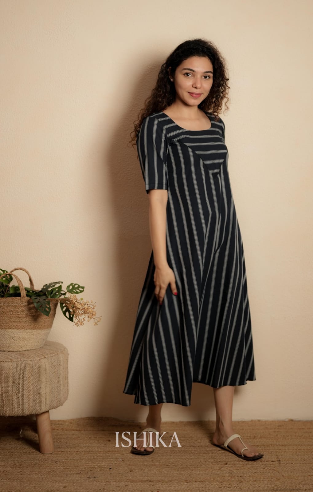 A-line cotton dress with a round neck and an asymmetrical yoke. The dress features elbow-length sleeves . Feeding Zip Placed across the yoke. ( 2 invisible Zips)