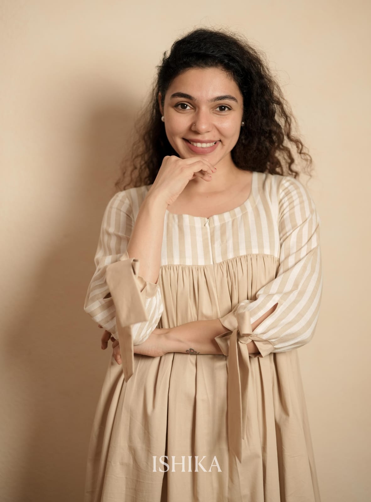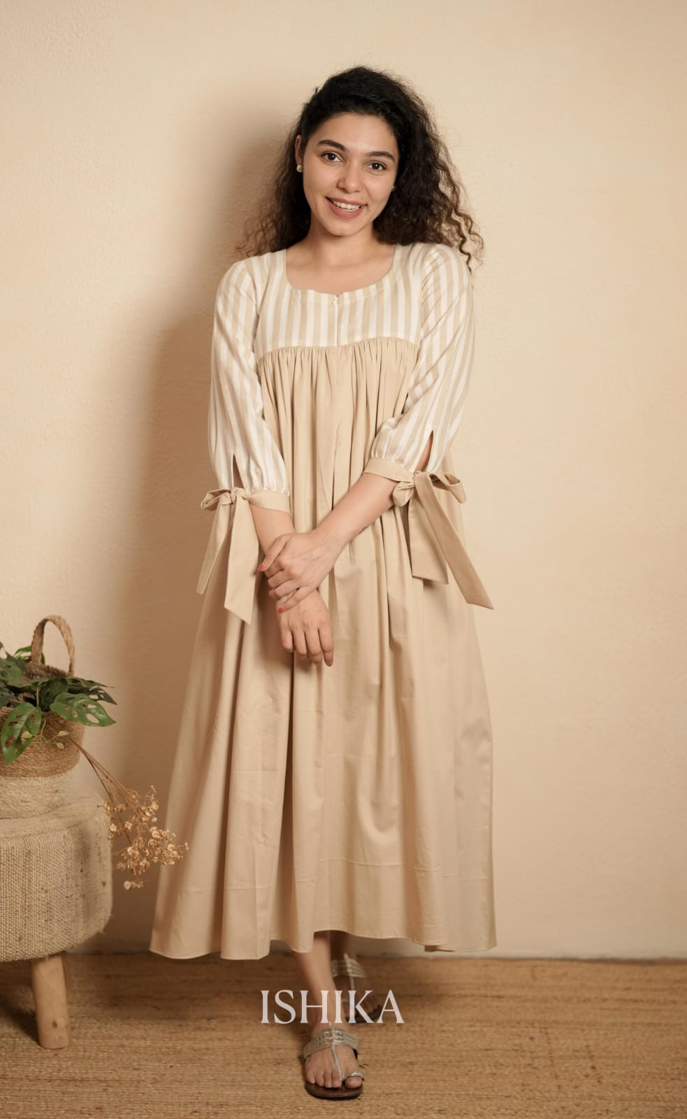 Cotton A-line Dress with Round Neck Patch on Yoke with Beige and white stripes. Gathers on Yoke. Striped patterns with trendy tie-up details and Pleats at the sleeve ends. Feeding Zip on the yoke. ( 1 invisible Zip)