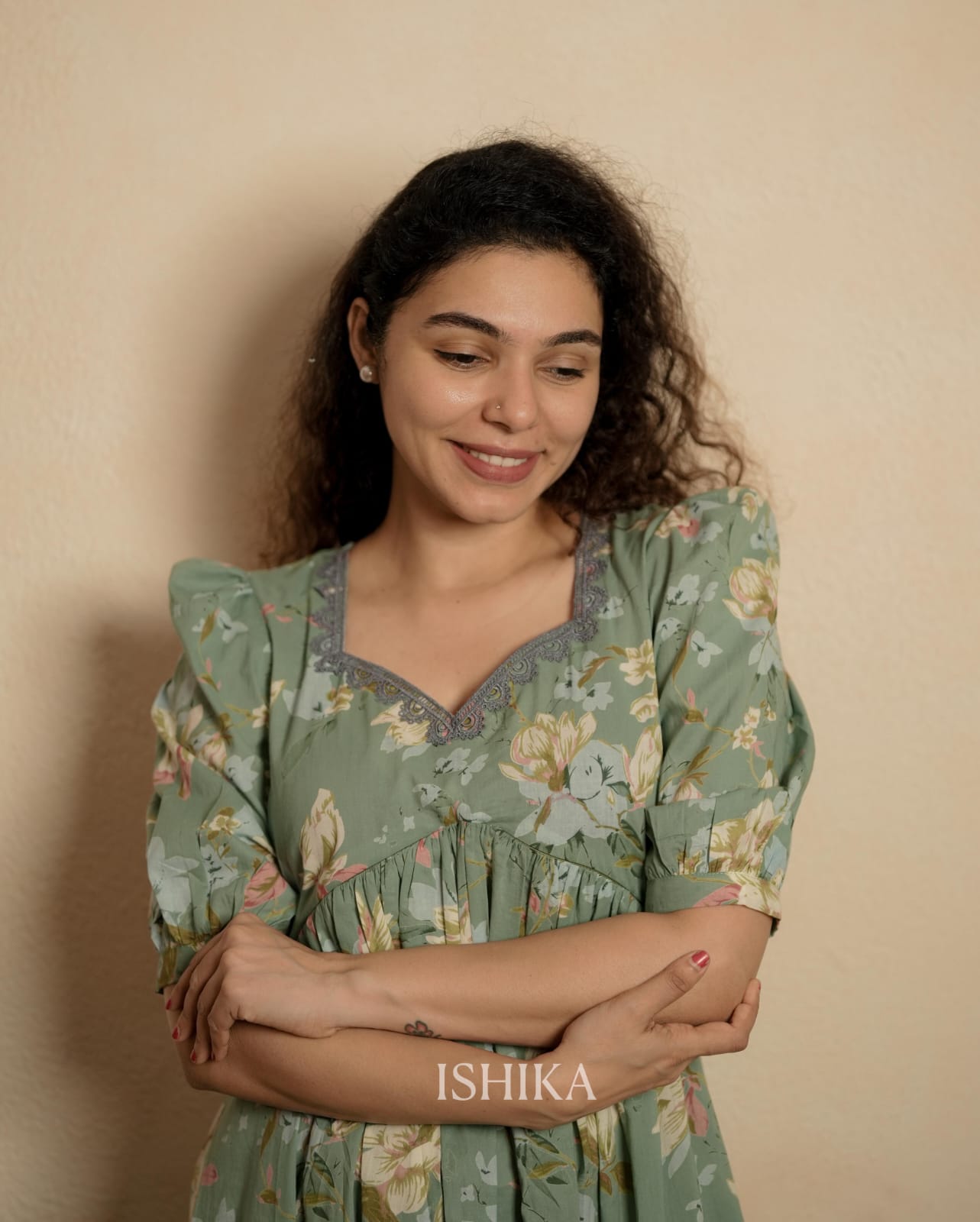 Alia Cut Cotton Dress with Sweet Heart Neck with Lace. Gathers on Yoke. Elbow sleeve with puff on top and pleats on sleeve end. Feeding Zip Placed across the yoke. ( 2 invisible Zips)
