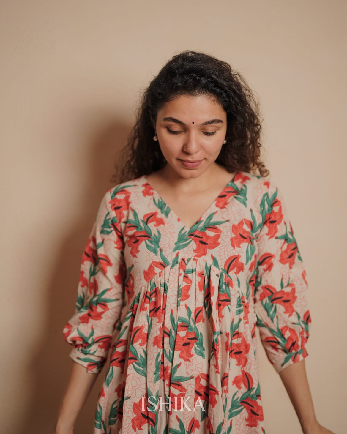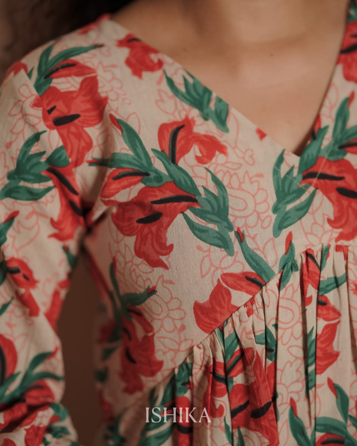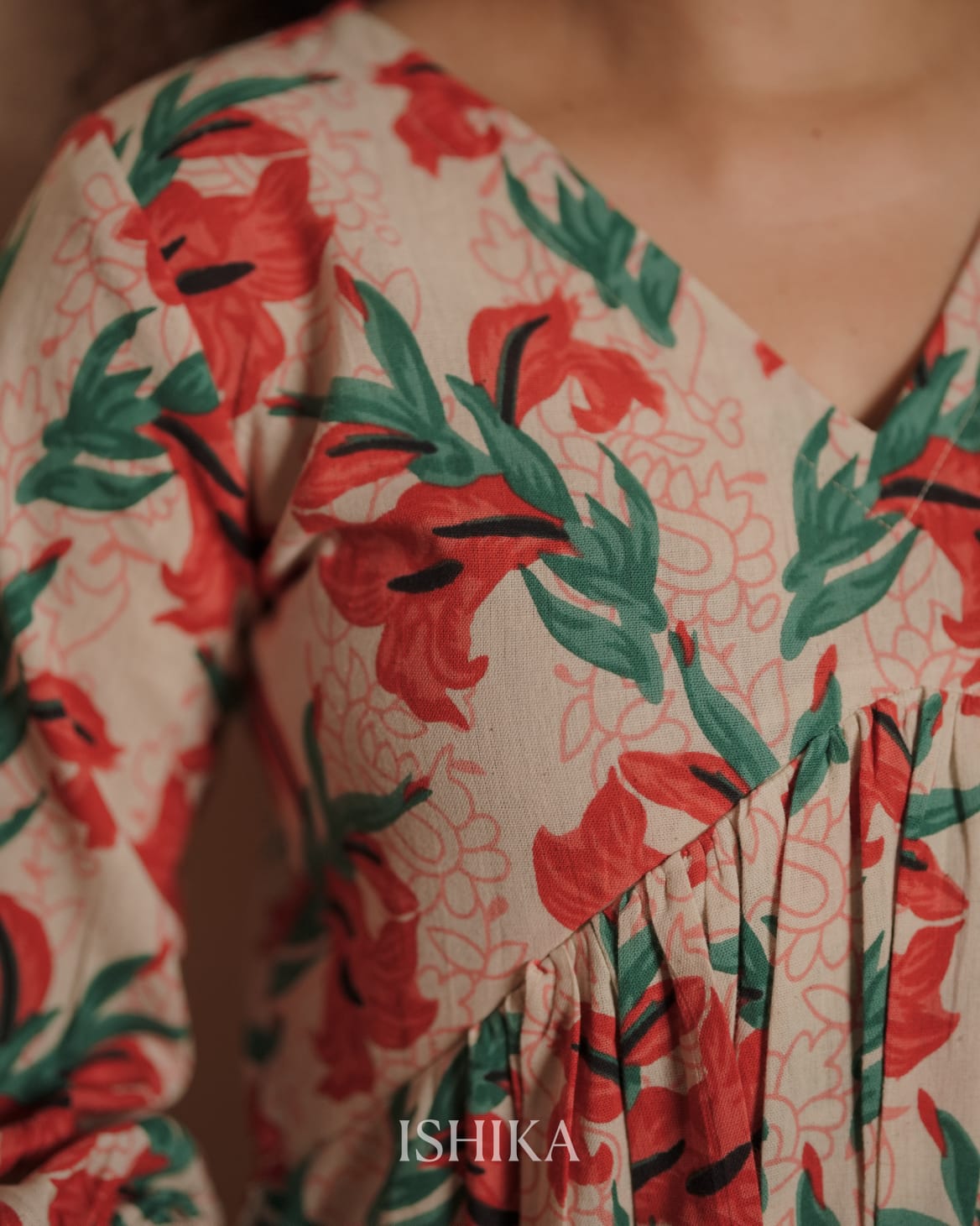 Alia Cut Cotton Dress with V-neck. Designed with pleats on the yoke and added pleats at the sleeve ends. Feeding Zip Placed across the yoke. ( 2 invisible Zips)