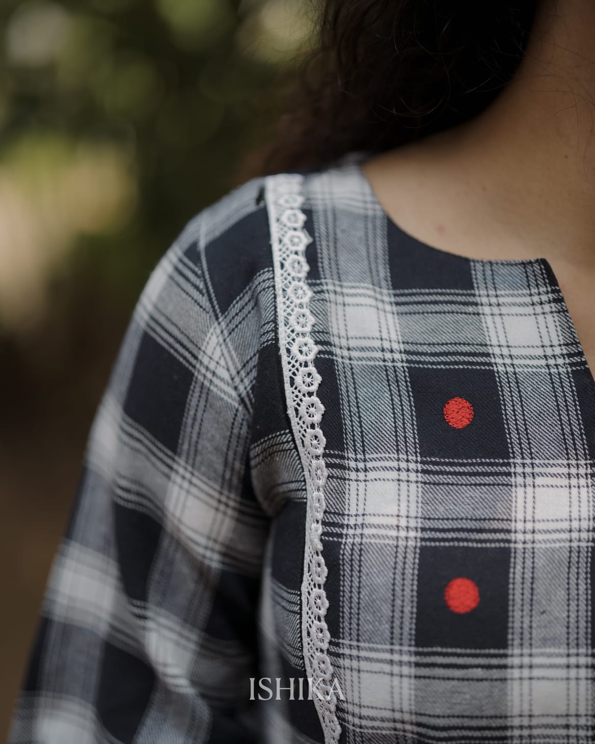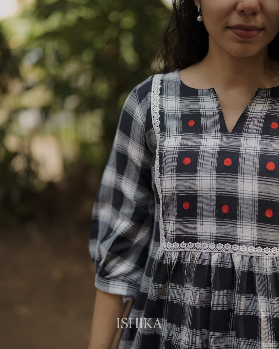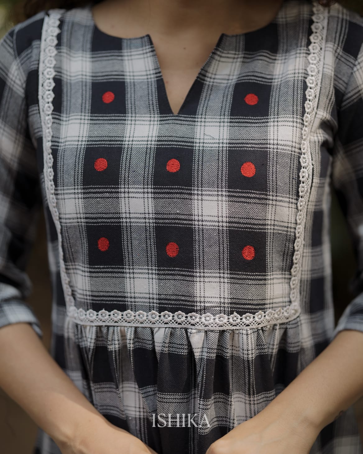 Premium High-quality soft cotton A-line dress with checkered pattern and Slit on Neck. Gathers on waist. Lace on Yoke. Pleats added on end of the sleeves. Red Embroidery Dots for detailing the Yoke. For Feeding Zip Placed on the yoke. (2 invisible Zips).