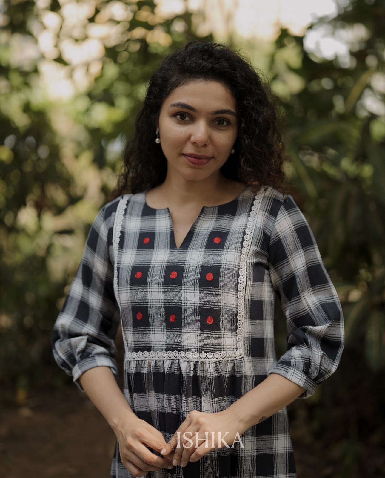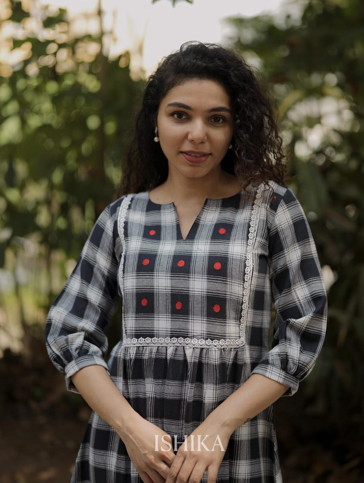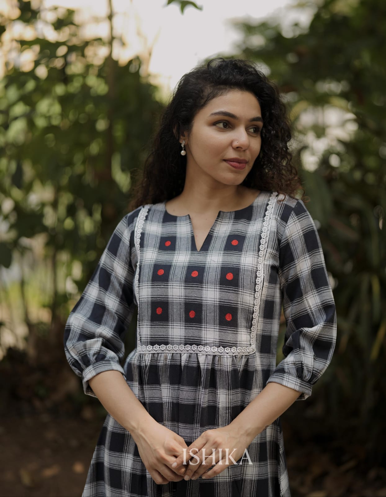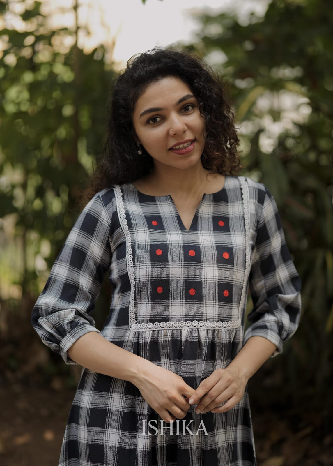 Premium High-quality soft cotton A-line dress with checkered pattern and Slit on Neck. Gathers on waist. Lace on Yoke. Pleats added on end of the sleeves. Red Embroidery Dots for detailing the Yoke. For Feeding Zip Placed on the yoke. (2 invisible Zips).