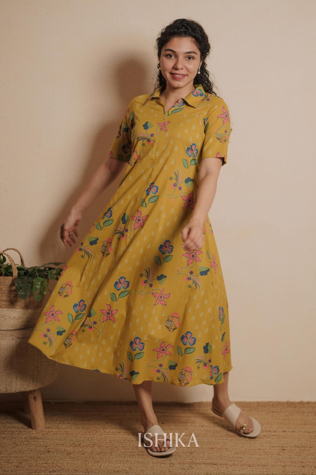 Printed Cotton A-Line Dress with Shirt Collar. Feeding Zip Placed on the yoke. (1 invisible Zip).