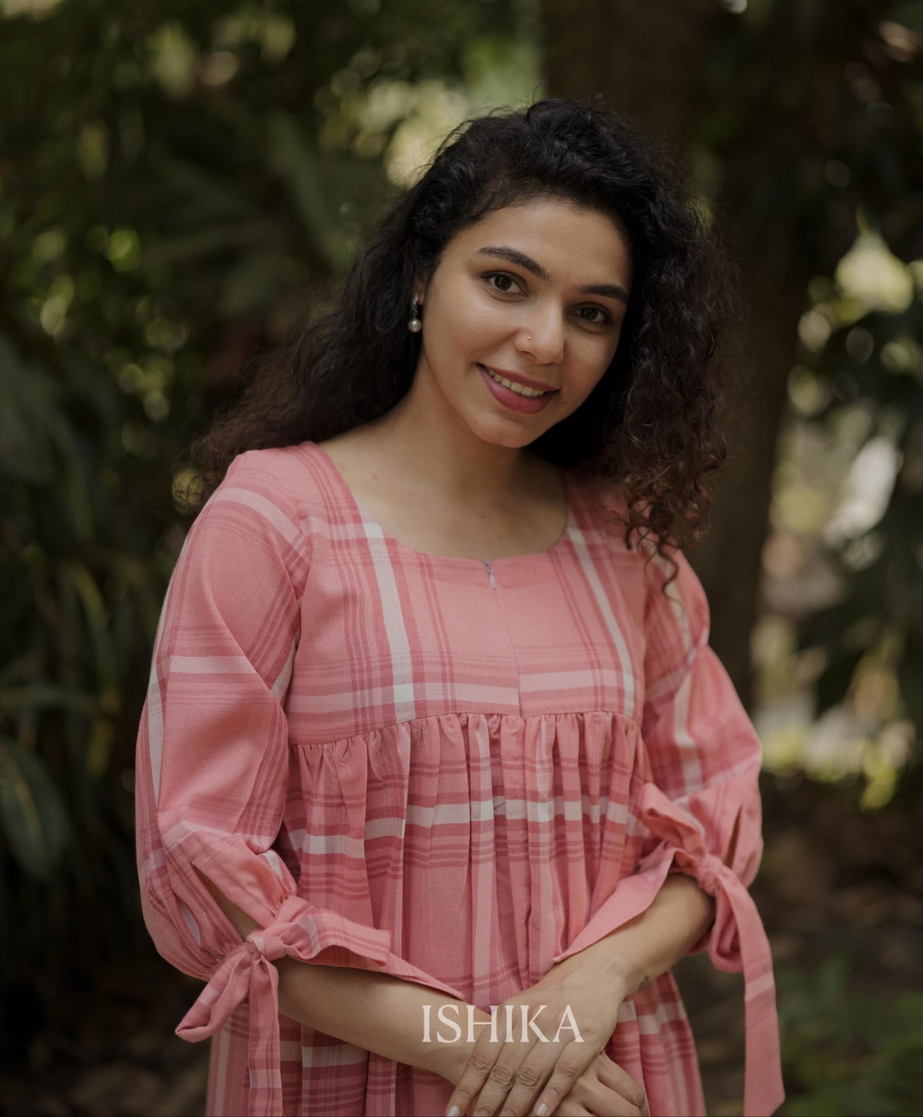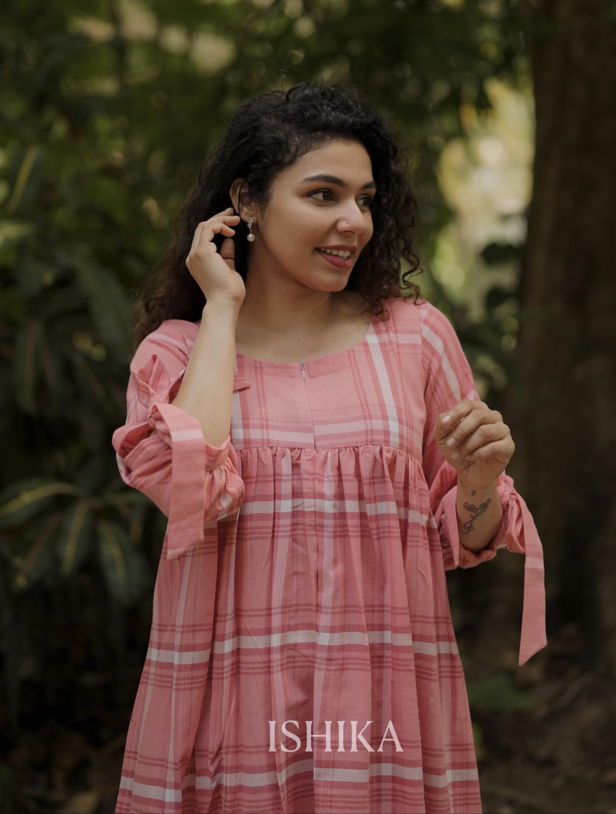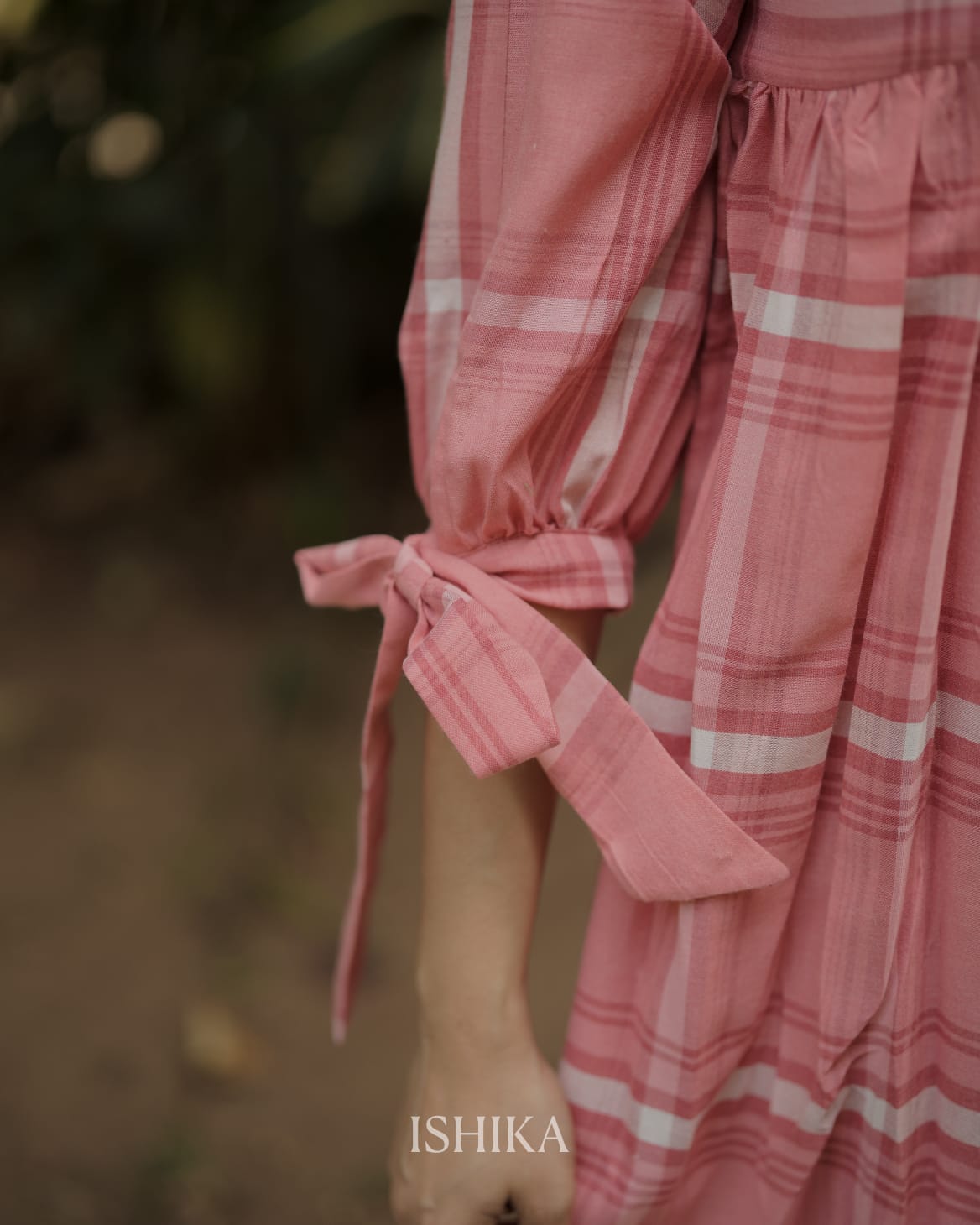Cotton A-line Dress with Round Neck . Gathers on Yoke. Checkered pattern with trendy tie-up details and pleats at the sleeve ends. Feeding Zip Placed on the yoke. ( 1 invisible Zip)