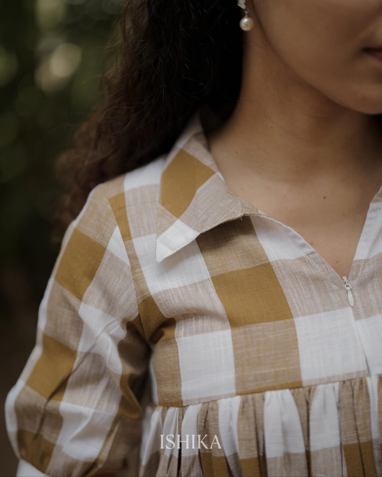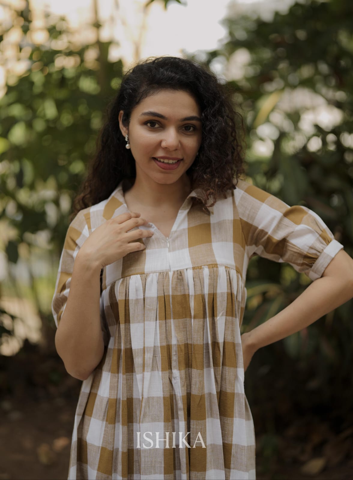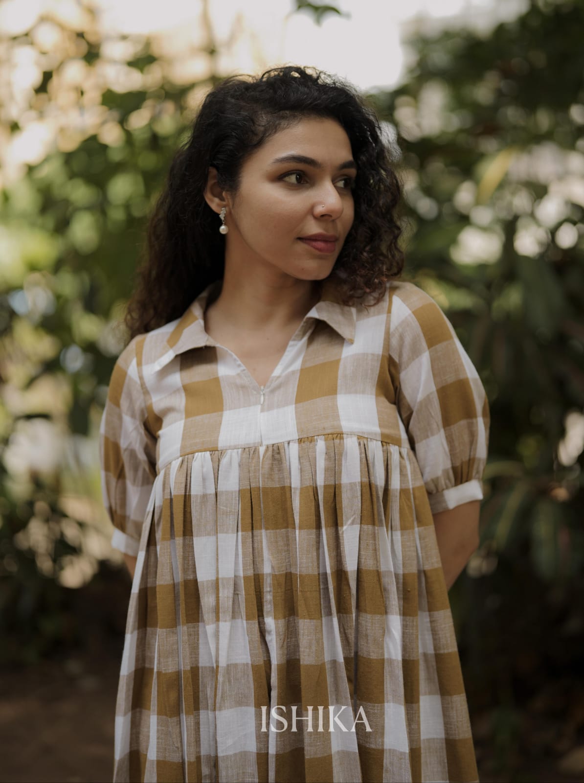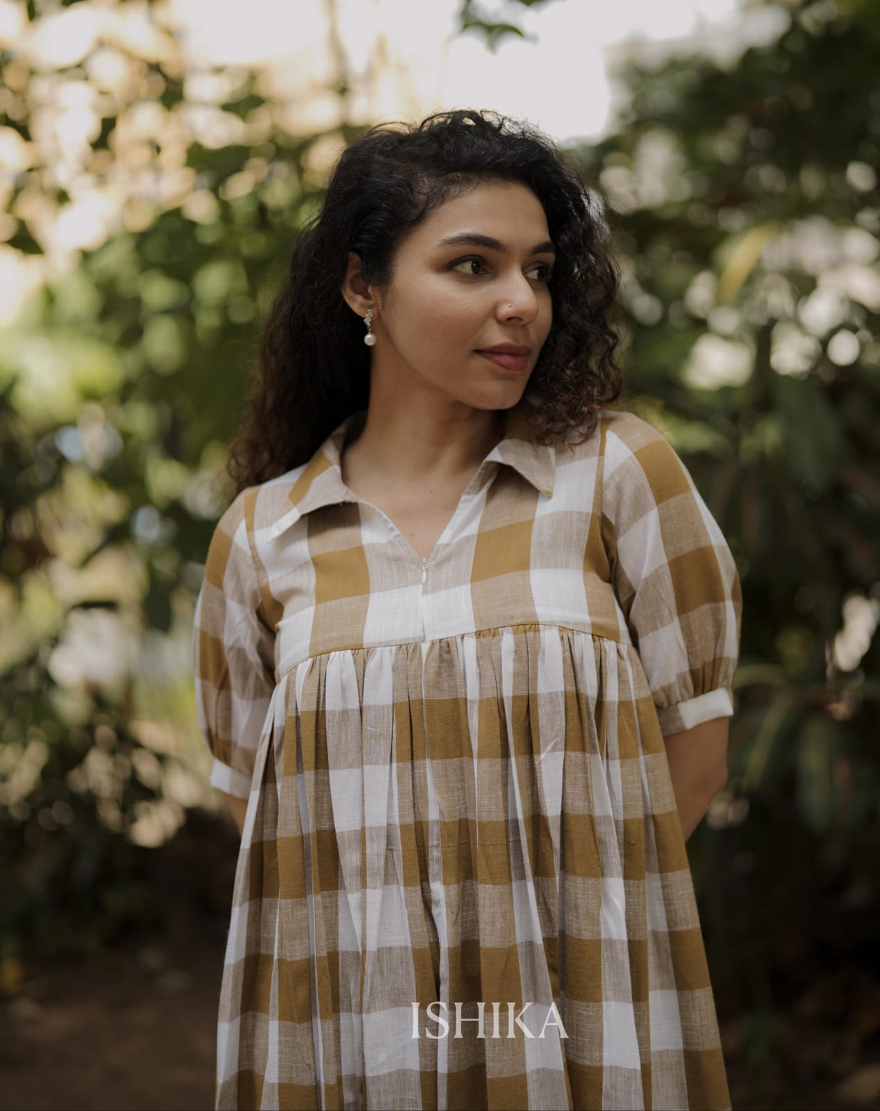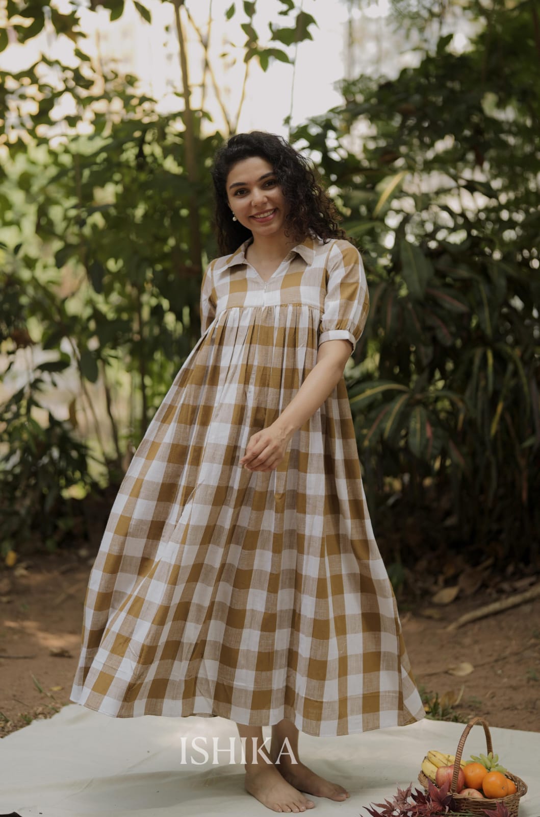 Cotton A-Line Dress with Shirt Collar. pleats added on end of the sleeves. Gathers on Yoke. Feeding Zip Placed on the yoke. (1 invisible Zip).