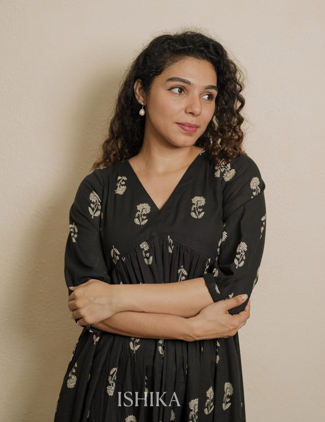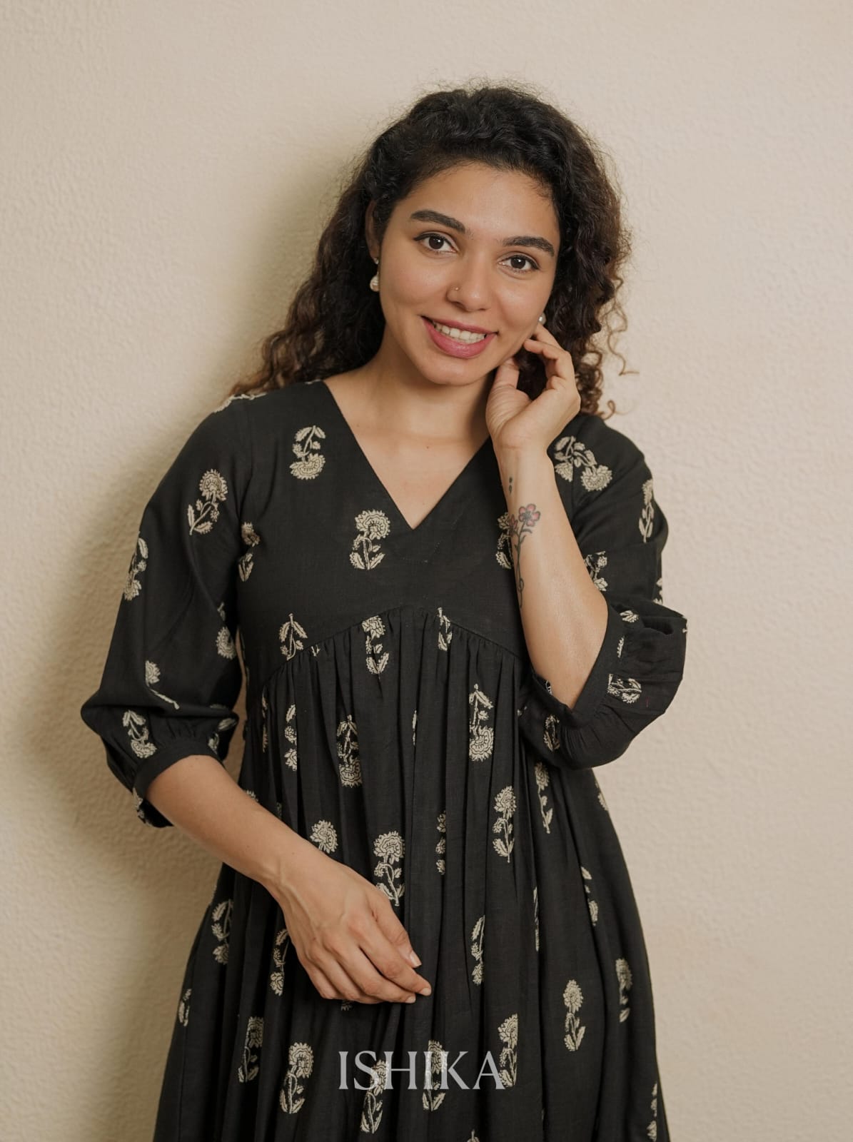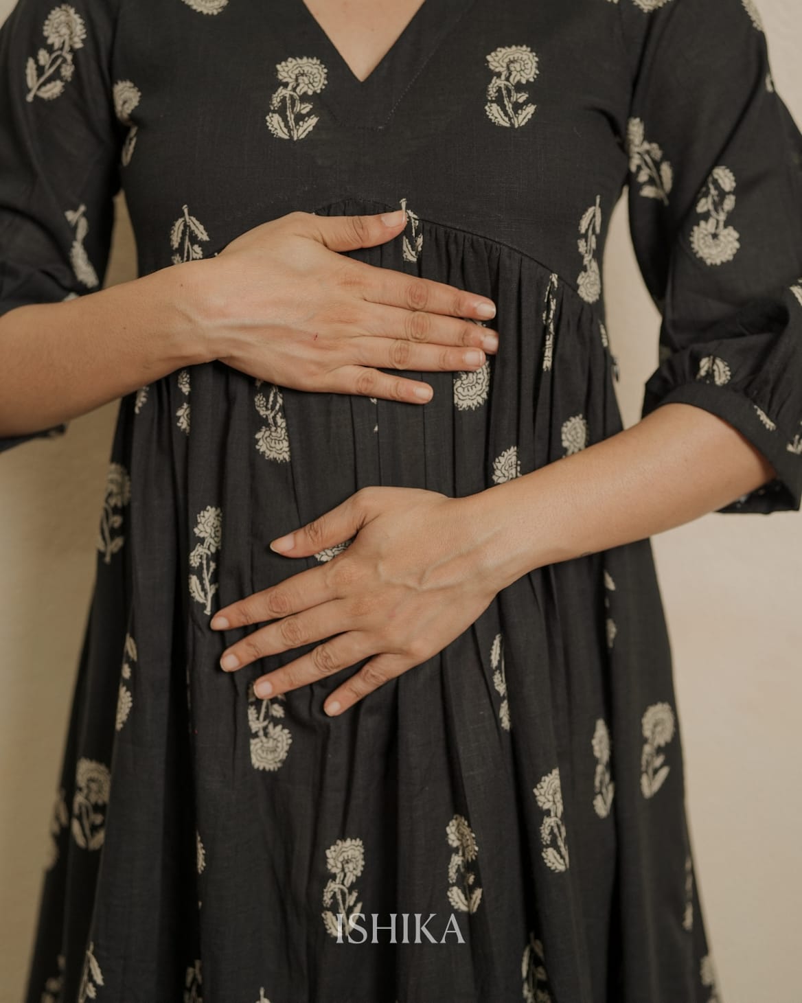 Alia Cut Cotton Dress with V Neck. Gathers on Yoke. Pleats added on end of the sleeves. Feeding Zips Placed across the yoke. ( 2 invisible Zips)