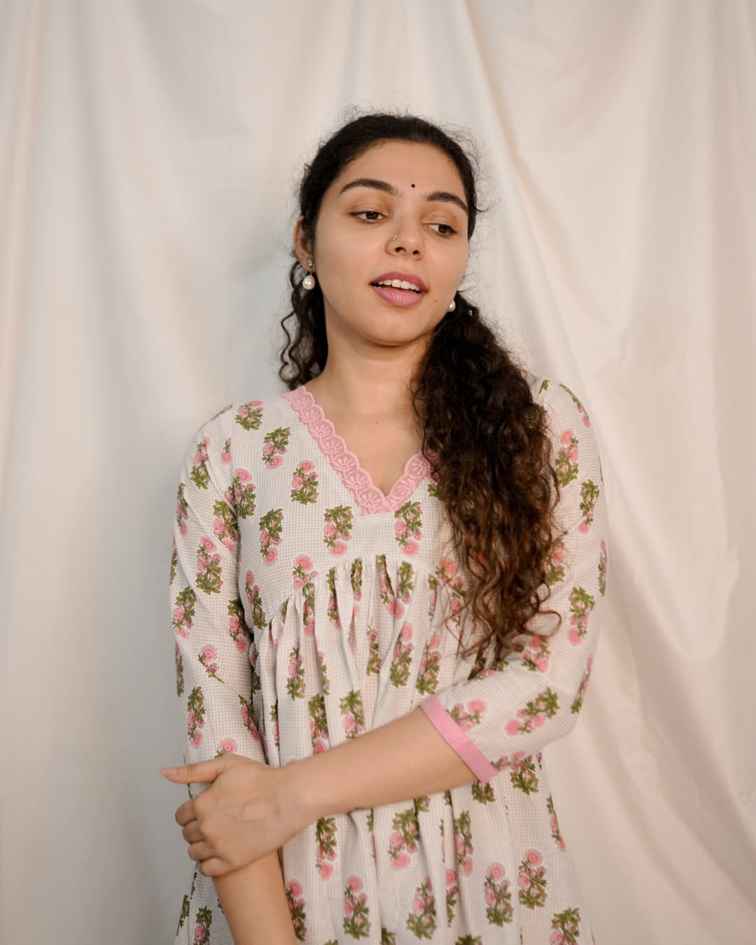 Alia Cut Cotton Dress with V Neck. Gathers on Yoke. Lace on neck and sleeve end. Feeding Zip Placed across the yoke. ( 2 invisible Zips)